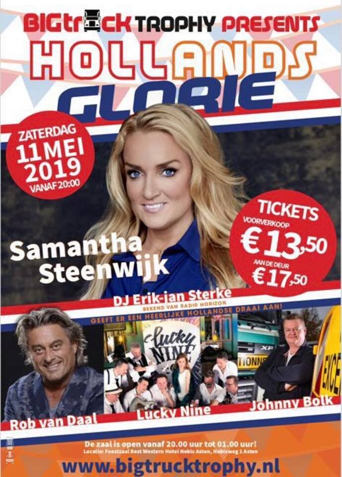 Het muziekprogramma voor de BIGtruck Trophy is bekend! Op zaterdagavond 11 mei houden we een gezellige 'Hollands Glorie' muziekavond met als top act Samantha Steenwijk. Verder komen Rob van Daal en de Top 40 band Lucky Nine optreden. Ook Johnny Bolk is van de partij, zowel s'middags als s'avonds !