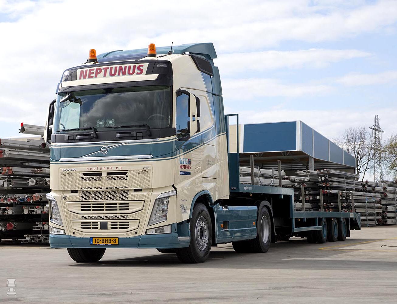 Voor het transport van alles wat er komt kijken bij zo'n tijdelijk gebouw zet Neptunus voortaan een nieuwe Volvo FH trekker in. Eigen transport is voor Neptunus Structures van groot belang. Betty Eilers: “Het maakt ons flexibel. Het wagenpark bestaat nu uit vijf trekkende eenheden, diverse opleggers en twintig montage-bussen. Onze chauffeurs komen meestal als eerste aan op een locatie en blijven daar tijdens het lossen van ingehuurd transportmaterieel. Zij zijn veel meer dan alleen chauffeur.” Betty maakte voor het eerst kennis met de nieuwe Volvo FH tijdens een speciaal georganiseerde ladies day. “Ik was direct verkocht. De souplesse van de truck, de ruimte maar vooral het rijden maken het verschil.” Volvo was geen onbekende voor de familie Eilers. Zo maakte Betty haar eerste kilometers ooit in een Volvo F10 en heeft vader Hans nog gereden in een Volvo L395. “Niet te vergelijken natuurlijk, maar het is zeker een merk dat ons na aan het hart ligt. Over de nieuwe Volvo FH zijn onze chauffeurs zeer tevreden. Het comfort is uitstekend en maakt dat je je werk goed kunt doen.” De FH is voorzien van Volvo Dynamic Steering, wat een revolutie is. Ook is de Volvo FH voorzien van het Active Safety pakket met Forward Collision Warning inclusief noodrem, Adaptive Cruise Control, Driver Alert Support System, Lane Change support System en het Lane Keeping Support System incl. Departure Warning. Een goed product, maar ook de relatie met Nebim is erg belangrijk. Betty vervolgt: “Zij begrijpen dat onze trucks en chauffeurs nooit te laat kunnen komen.''