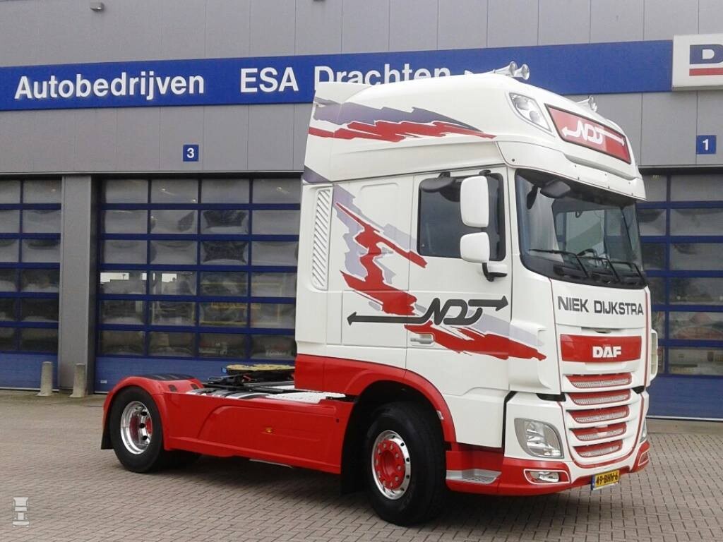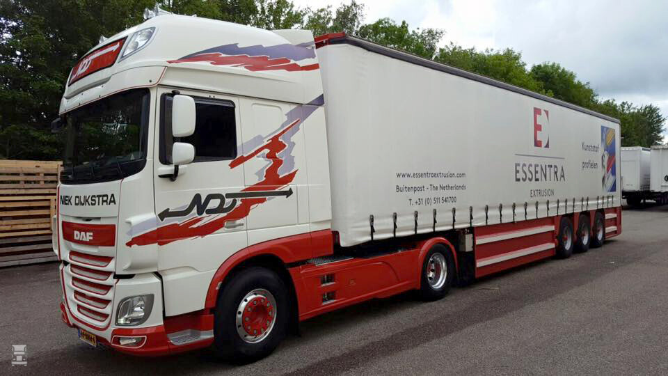 Speciaal voor deze klant uit Buitenpost zet Niek Dijkstra een dubbelstock oplegger in die geheel in de huisstijl van Essentra is uitgevoerd. Nu zijn de eigen trucks van Niek Dijkstra officieel bruin met een soort geel, maar inmiddels rijden er ook al witte, zilverkleurige en zelfs donkerrode trucks voor Dijkstra. Voor deze speciale oplegger koos het bedrijf er echter voor om een nieuwe DAF XF SuperSpaceCab te bestellen in bijpassende kleuren. Daarmee ontstaat een schitterend fris geheel waarmee Niek Dijkstra wat mij betreft echt kleur bekent!