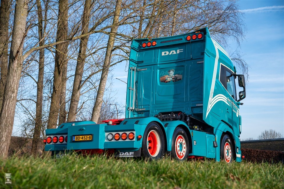 De vrachtwagen is met zorg opgebouwd tot een echte blikvanger. De 6x2 trekker is goedgekeurd voor een totaalgewicht tot 50 ton en gaat dus op pad met zware ladingen. Binnenkort ontvangt Bennie Achterkamp een tweede zware DAF. Dit is een XF FTS, ook met 530 pk. Deze trekker heeft een lage cabine, wat ons heel erg nieuwsgierig maakt naar het eindresultaat.