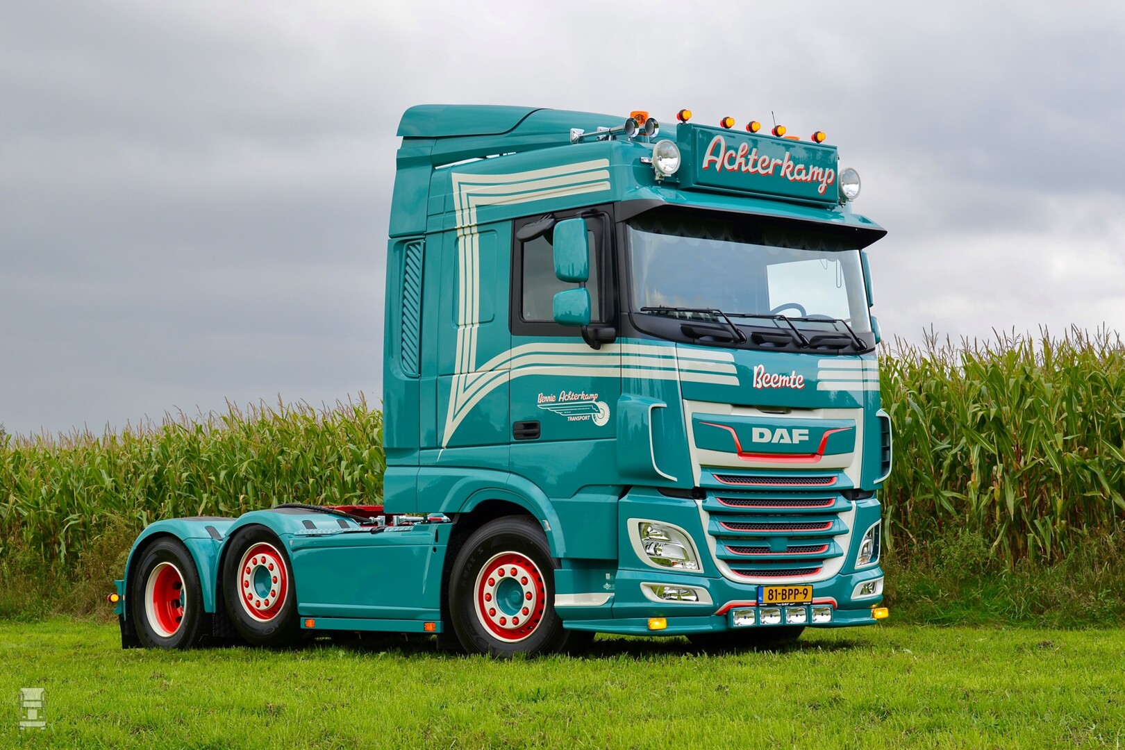 Zo werd er een extra lijst aangebracht onder de zijskirts, en werd er een onderspoiler met verlichting gemonteerd. Het kleurpatroon is typisch Achterkamp, met veel aandacht voor detail. Erg geslaagd vinden we verder de Engelse zonneklep met de zwarte omlijsting van de ramen. Ook de speciale achterbumper draagt bij aan het geslaagde uiterlijk van deze nieuwe DAF. De stoere lichtbak met extra verlichting maakt het plaatje af. De trekker werd geleverd door Bakker Bedrijfswagens.