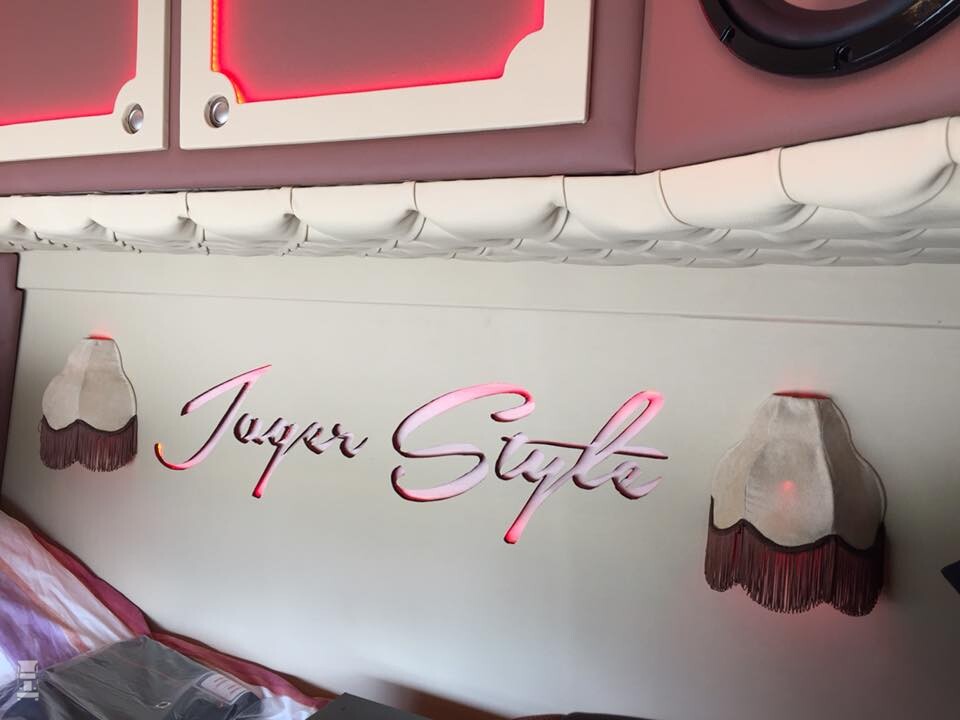 Met zijn LED koplampen, het lederen DAF interieur en de fraaie Alcoa wielen is het een bijzonder complete trekker geworden. Diverse extra werklampen en andere verlichting en een extra onderspoiler maken iets bijzonder van deze DAF. Drive in Style/ a drive for Truck interiors & Truckstyling heeft de bullbar gemonteerd en het complete interieur aangepakt inclusief een high-end audio systeem en een custom made kast.
