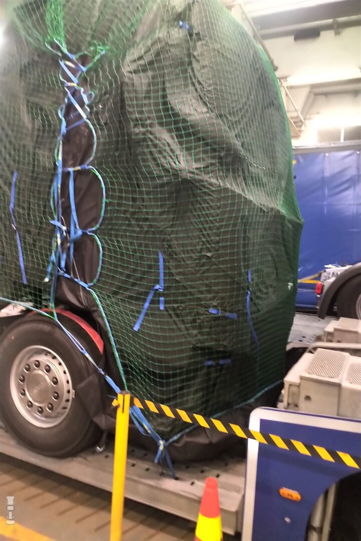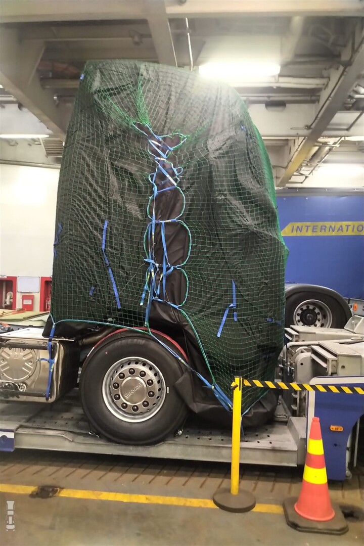 Paul Bennink zag de ingepakte vrachtwagen op een transporter op de veerboot en wist meteen dat het iets bijzonders is. De cabine is flink ingepakt om te verbergen wat eronder zit, maar de velgen geven direct weg dat we hier met een Scania te doen hebben (of een heel slimme concurrent, maar dat zal wel niet). Wat direct opvalt is het bolle front, waarmee de nieuwe generatie Scania mee lijkt te gaan doen met de nieuwe Europese regels. Scania is een van de laatste merken die nog geen langere, aerodynamische cabine aanbiedt.