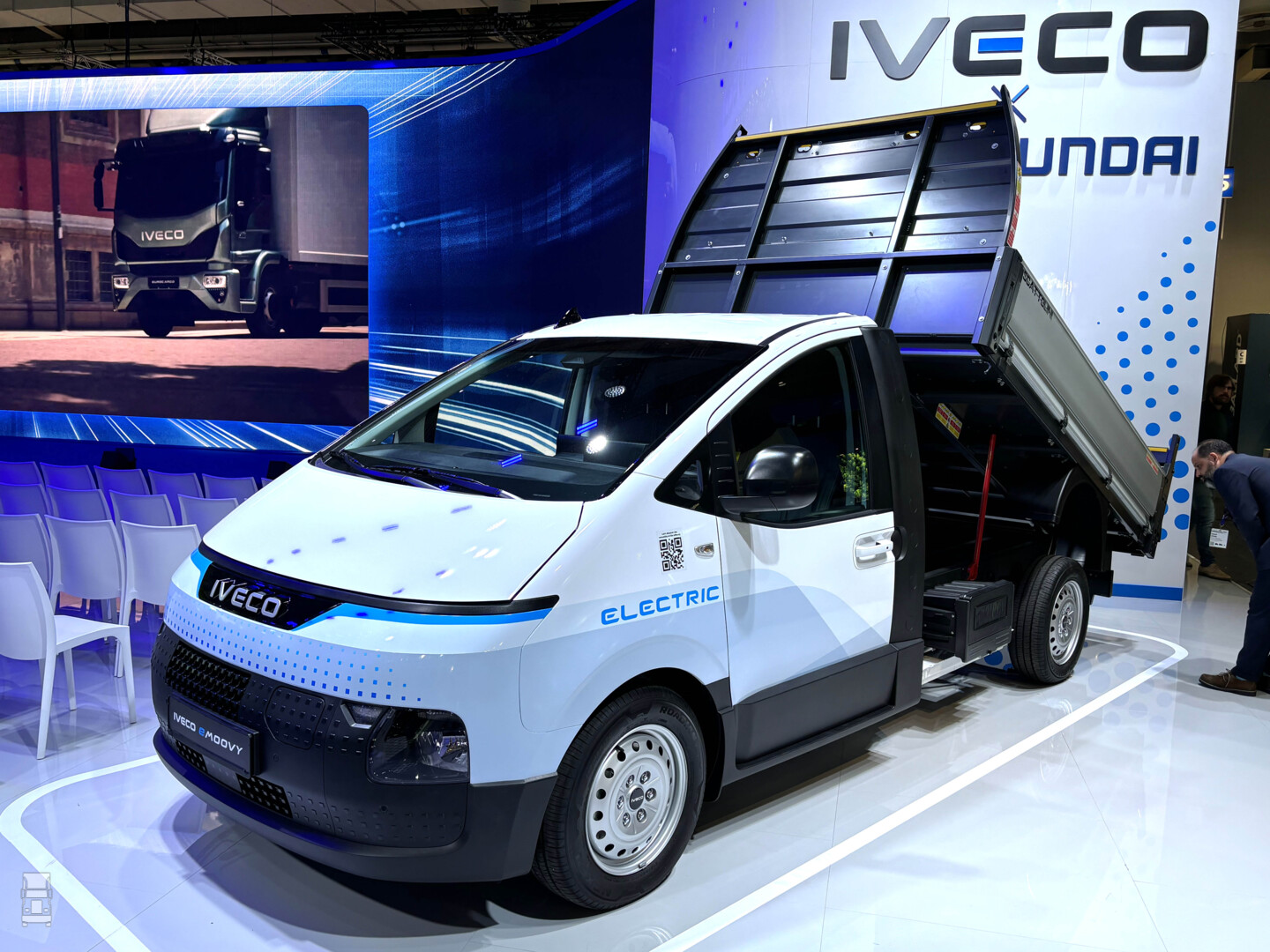 De eMoovy is een opvallende verschijning met zijn gestroomlijnde cabine. Het interieur van deze, kleinste Iveco is verrassend ruim en praktisch ingedeeld. Zo is de vlakke vloer bekleed met rubber, handig schoon te maken dus. Op de IAA toonde Iveco een model met een kippertje, maar gesloten carrosserieën zijn natuurlijk ook mogelijk. Het laadvermogen bedraagt 1,5 ton en een opbouw tot 10 kuub is mogelijk. De mini Iveco is goed voor 320 kilometer rijden op één lading. Door met 350 kW te laden komt daar per 10 minuten weer 100 kilometer bij als je niet uitkomt met die 320 kilometer.