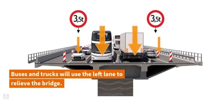 Om, gedurende de bouw van de nieuwe viaducten de druk op de brug te verlichten wordt er een bijzondere indeling ingesteld van de rijbanen. De rechter rijstrook in beide richtingen wordt straks uitsluitend voor voertuigen tot 3,5 ton. Trucks en bussen moeten de linker rijstrook aanhouden. Hierdoor wordt de druk op de brug beter verdeeld, aangezien de pijlers in het midden van de vier rijbanen staan.