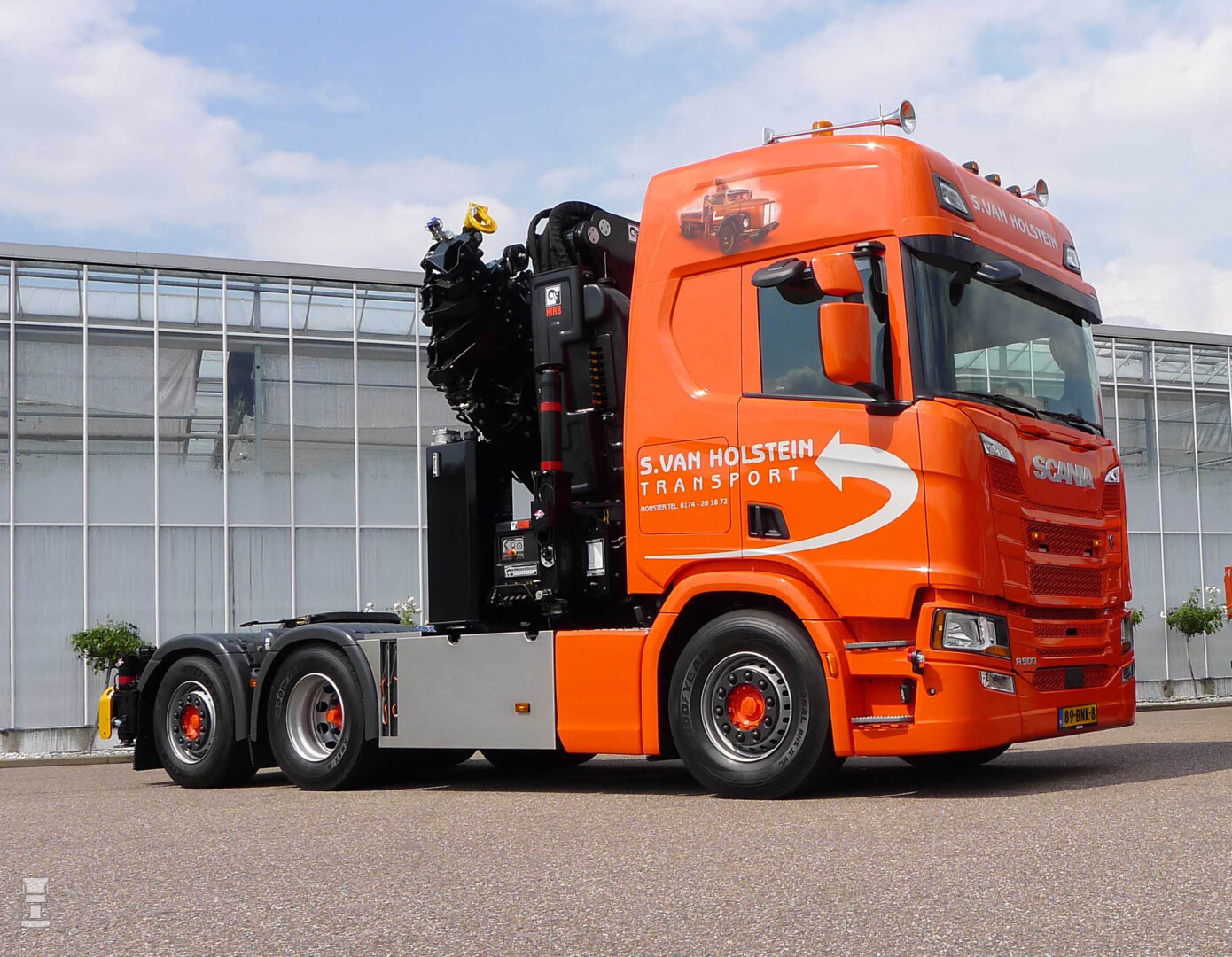 Het bedrijf van Sander van Holstein staat in de omgeving bekend als ‘transport mét kraan’. En dat is ook precies het specialisme van het bedrijf. “Wij zitten in de kassenbouw en we verhuren containers. In beide gevallen is het van belang dat je het hele transport in één keer kunt afhandelen. Vandaar dat al onze trucks een laadkraan hebben. Dat is efficiënt en snel. Dus toen we in de markt waren voor een nieuwe trekker was het een vereiste dat we er zonder problemen een stevige hijsinrichting op konden plaatsen.”