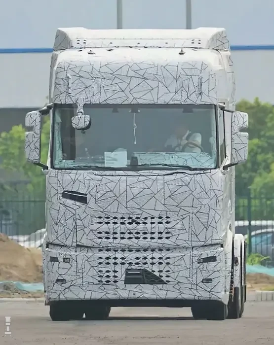 De witte truck op de foto heeft duidelijk een ander front dan wat we nu kennen en het lijkt wat boller en ronder. Dat is de trend tegenwoordig, zie de Volvo Aero en de Mercedes-Benz ProCabin. Op het gedeelte naast de radar zien we een stuk camouflage dat weggescheurd lijkt te zijn, en daar achter ontwaren we een hele nieuwe grille met een patroon zoals we dat niet kennen van dit merk.
