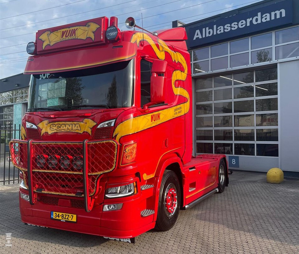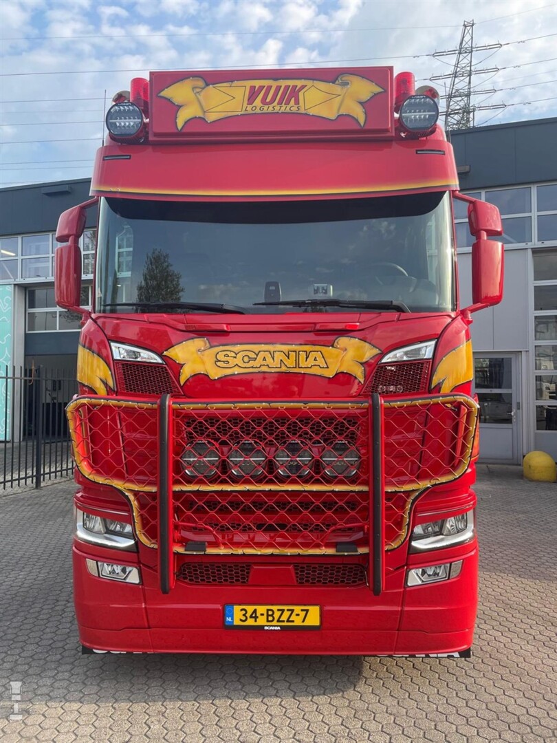 Natuurlijk is het direct het felrode spuitwerk dat de aandacht trekt bij de nieuwe Scania van Vuik. Zoals altijd loopt er een mooi gespoten gele band over de cabine. Uiteraard valt ook de forse bullbar op. Wie echter wat langer kijkt, ziet steeds meer opvallende details bij de trekker. Deze maken van deze Scania een echte showtruck, uniek in zijn soort.