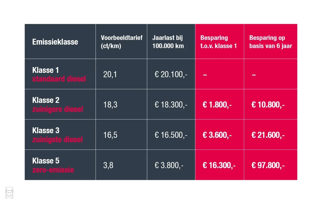 De CO2 eisen zullen de komende jaren alleen maar strenger worden en daarvoor worden de VECTO klasses jaarlijks per 1 juli herzien. Trucks die voldoen aan de huidige VECTO klasse 3 komen na 1 juli dan ook meestal niet meer in aanmerking voor die categorie, waardoor ze duurder worden in de vrachtwagenheffing. Door nu nog een nieuwe truck te registreren voor die datum kun je de komende zes jaar profiteren van het lage tarief, daarna zal het duurder uitvallen.