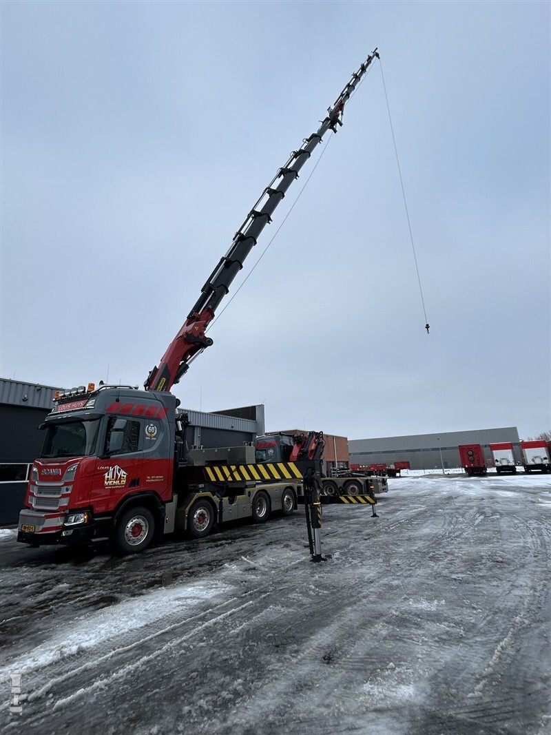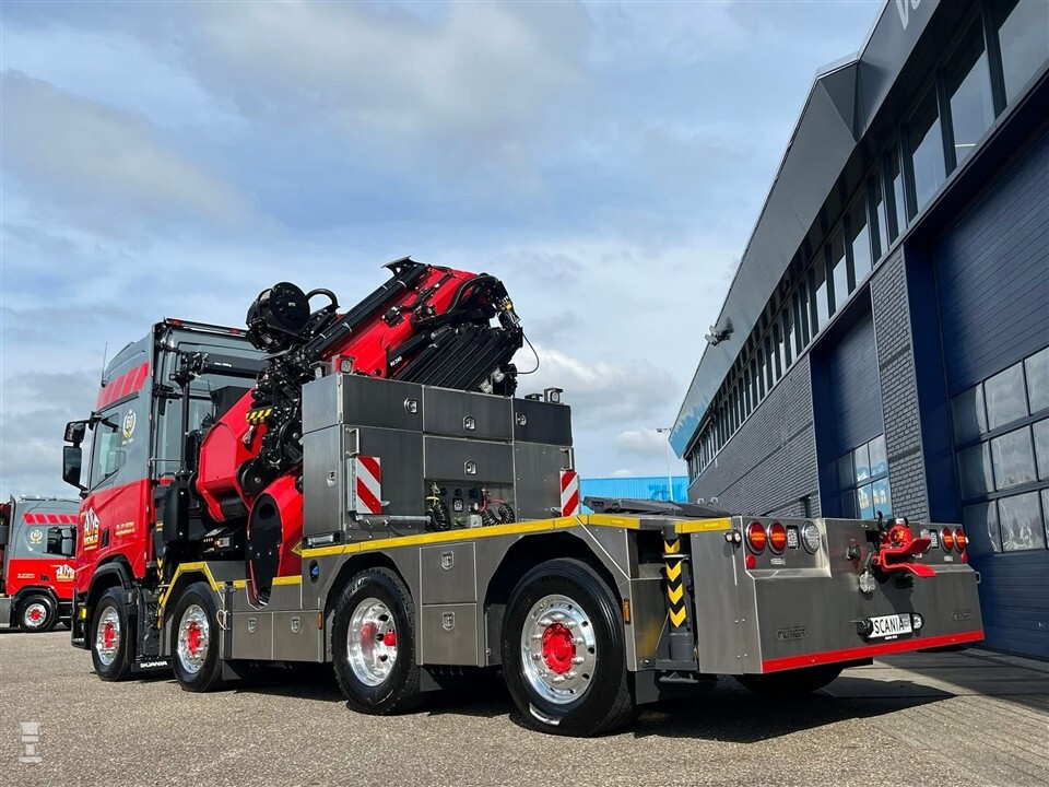 Het gaat hier ook nog eens om een primeur. De Scania R500 8x2 is de eerste vrachtwagen in Nederland die voorzien is van de Palfinger PK 1650 TEC. Deze nieuwe kraan is de opvolger van de PK 165.002 TEC7 en heeft een vlucht van niet minder dan 20,8 meter. Hier kan de kraan altijd nog 4.750 kilo tillen. Met een fly-jib gaat de gestrekte vlucht zelfs naar 33,4 meter. Uiteraard is de Scania Super tot in de puntjes opgebouwd, met veel handige RVS kisten.