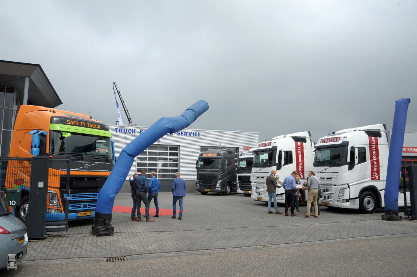 Tussen de occasions, waaronder een fraaie Kenworth trekker stond een hele rij nieuwe Volvo trucks. Een aantal van die voertuigen werd vandaag ook afgeleverd. Zo ontving Boonstra Transport twee FH trekkers, gingen er ook twee naar Logiflex en nam Holt Transport in Ten Boer ook een nieuwe FH in ontvangst.
