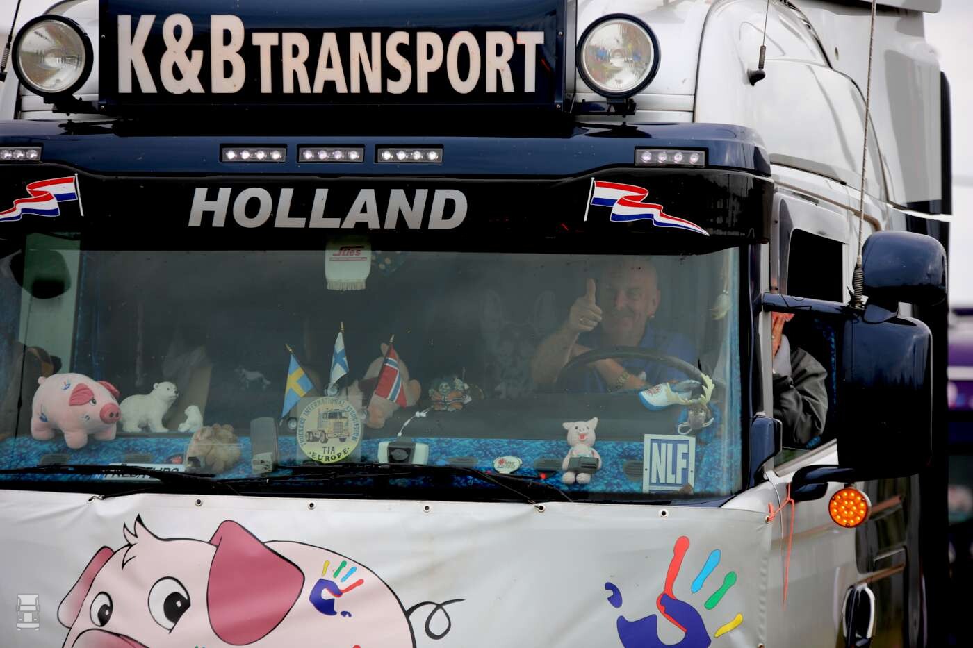 Gisteren werd er dus een bonte stoet van vrachtwagens verzameld bij het Ado stadion in Den Haag. Daar werden nog even de laatste dingen besproken en ging de colonne op weg over de A4 richting Leiden. Bij Leidschendam stond Aad en familie opgesteld. En met tranen en opgeheven armen werd er gezwaaid naar het toeterende en met groot licht passerende karavaan. Bij Leiderdorp draaide de hele stoet en inmiddels was Aad verplaatst naar het viaduct over de A4. Toen alle vrienden en collega`s opnieuw toeterend waren gepasseerd reed de ambulance met Aad terug naar het ADO stadion waar er nog afscheid werd genomen. Wel op gepaste afstand want we zitten nog midden in een crisis. De brancard werd langs de auto`s gereden en er was plek voor een laatste groet,herinneringen werden er opgehaald en er werd gelachen en gehuild. Een mooi afscheid voor een collega die binnenkort aan zijn laatste rit gaat beginnen.