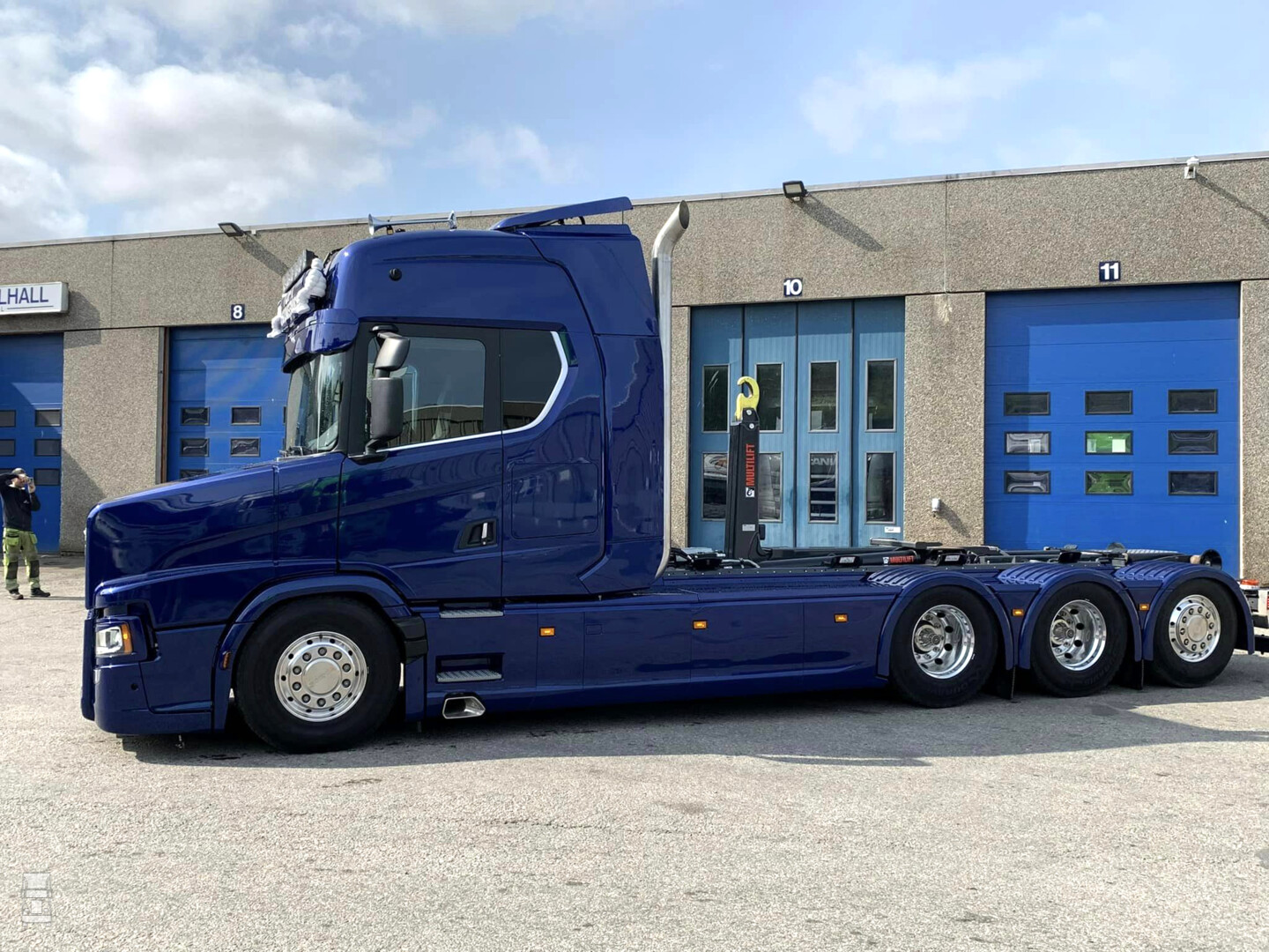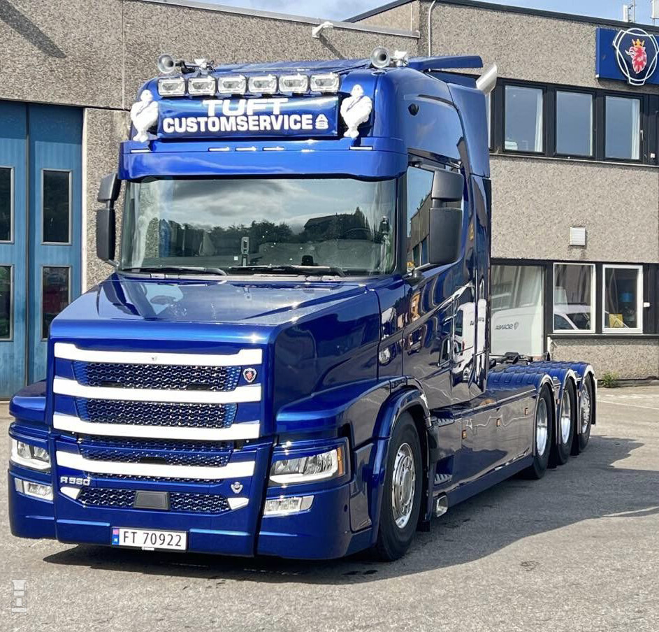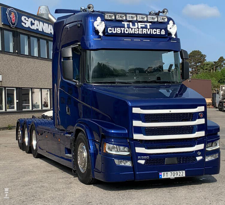 De in Noorwegen ontworpen neus loopt inderdaad grotendeels in dezelfde lijnen als die van de 143 T serie. Tuft CustomService bouwde de truck op basis van een Scania R530 Highline 8x4 bakwagen. Daardoor kon de neus wat lager worden dan die van de Vlastuin torpedo modellen. Die staan immers voor de hogere S- cabine. Het geheel ziet er bijzonder smaakvol uit en zoals je ziet is ook de voorbumper gewijzigd. De grille steekt nu iets uit waardoor het front wat meer vorm kreeg.
