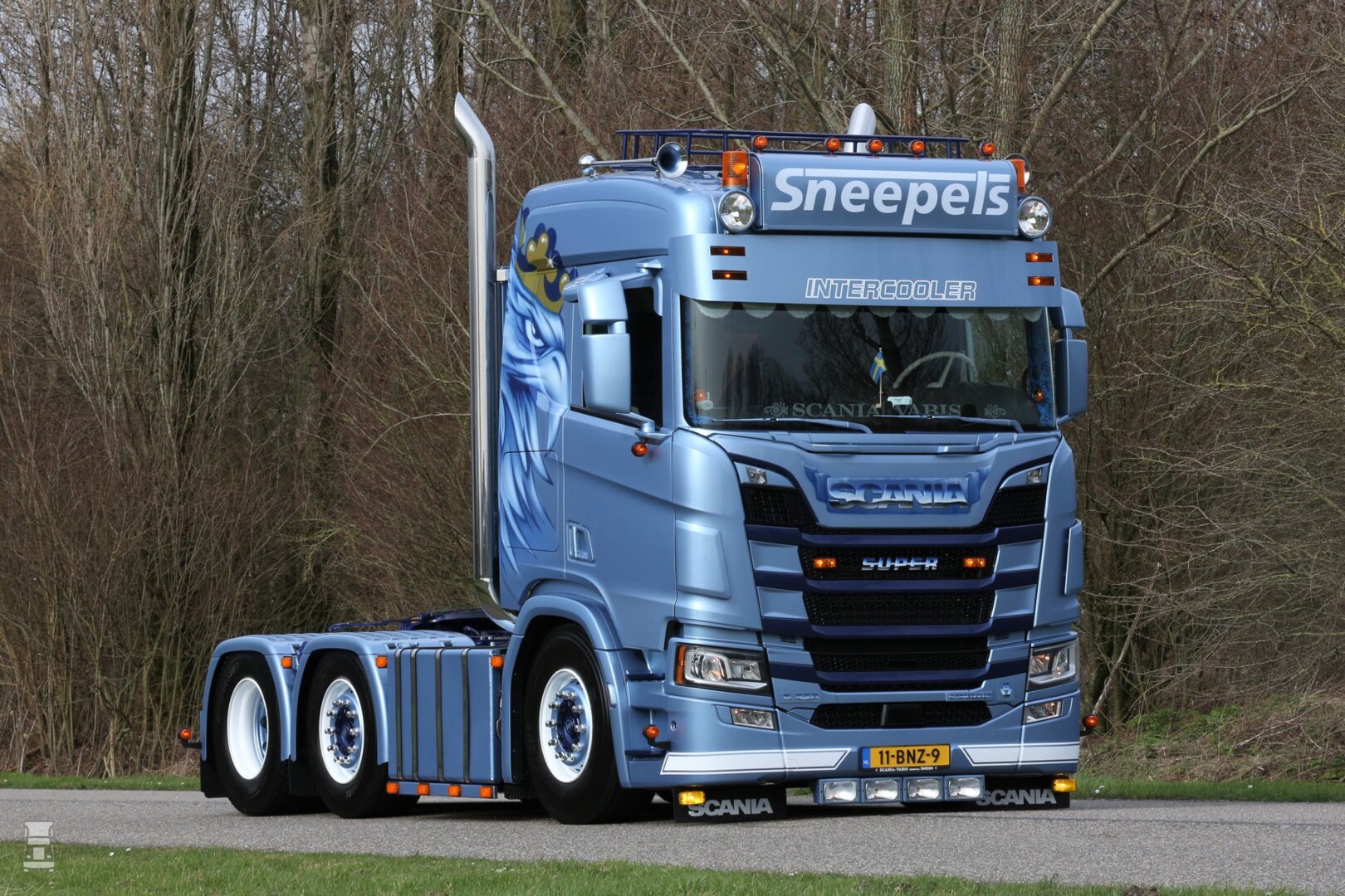 Sjaak Kentie Truckspecials BV heeft voor Sneepels Transport een Scania R520 met normaal dak aangepakt. De stoere V8 trekker met voorloopas werd behoorlijk onder handen genomen en het resultaat mag er zeker zijn!