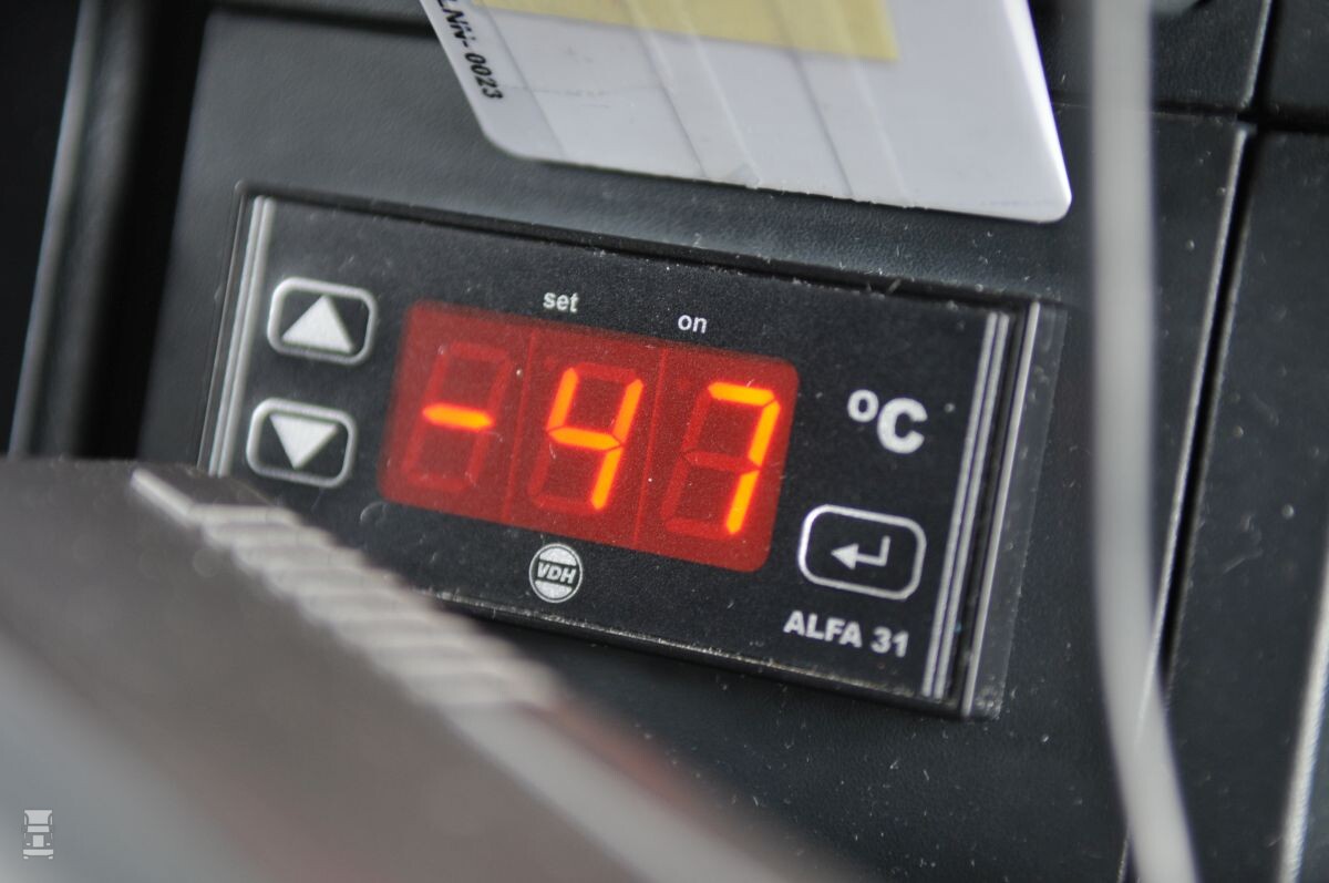 Om de lage temperatuur te kunnen garanderen, nam Müller geen halve maatregelen. Er werd een laadbak gebouwd met een dak van 20, en zijwanden van 16 centimeter dik. De Frigoblock koelmachine gaat tekeer, wanneer we Alfred op een hete septemberdag weer even spreken. Om die aan de gang te houden, heeft Alfred extra dieseltanks onder zijn MAN-chassis. In de cabine heeft hij een display waarop hij kan zien hoe koud het achter hem in de laadbak is. Zijn winterjas, ijsmuts en handschoenen heeft hij altijd bij zich in de cabine. Ook tijdens een hittegolf.