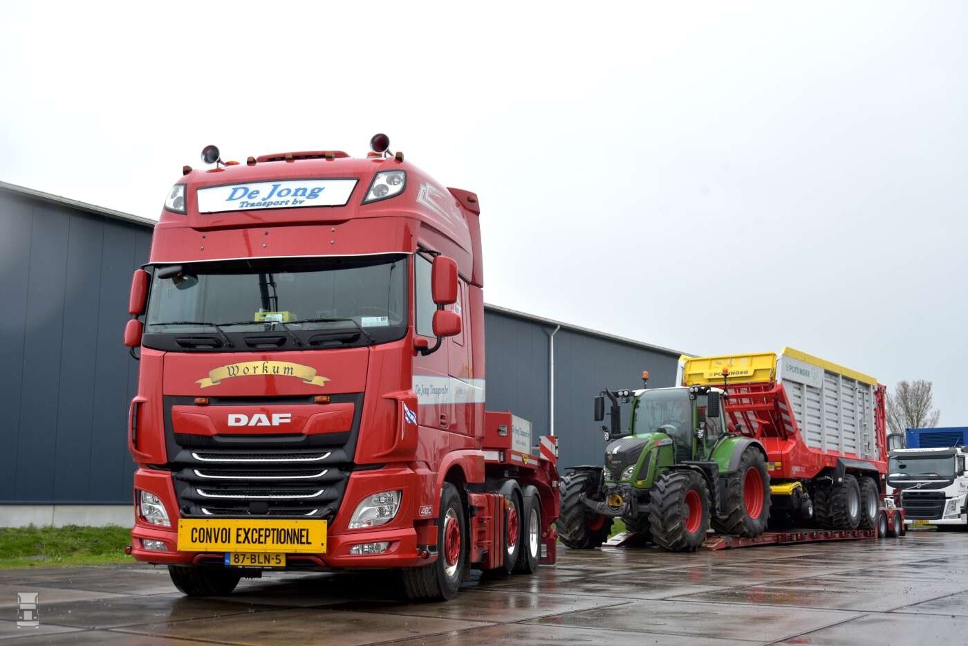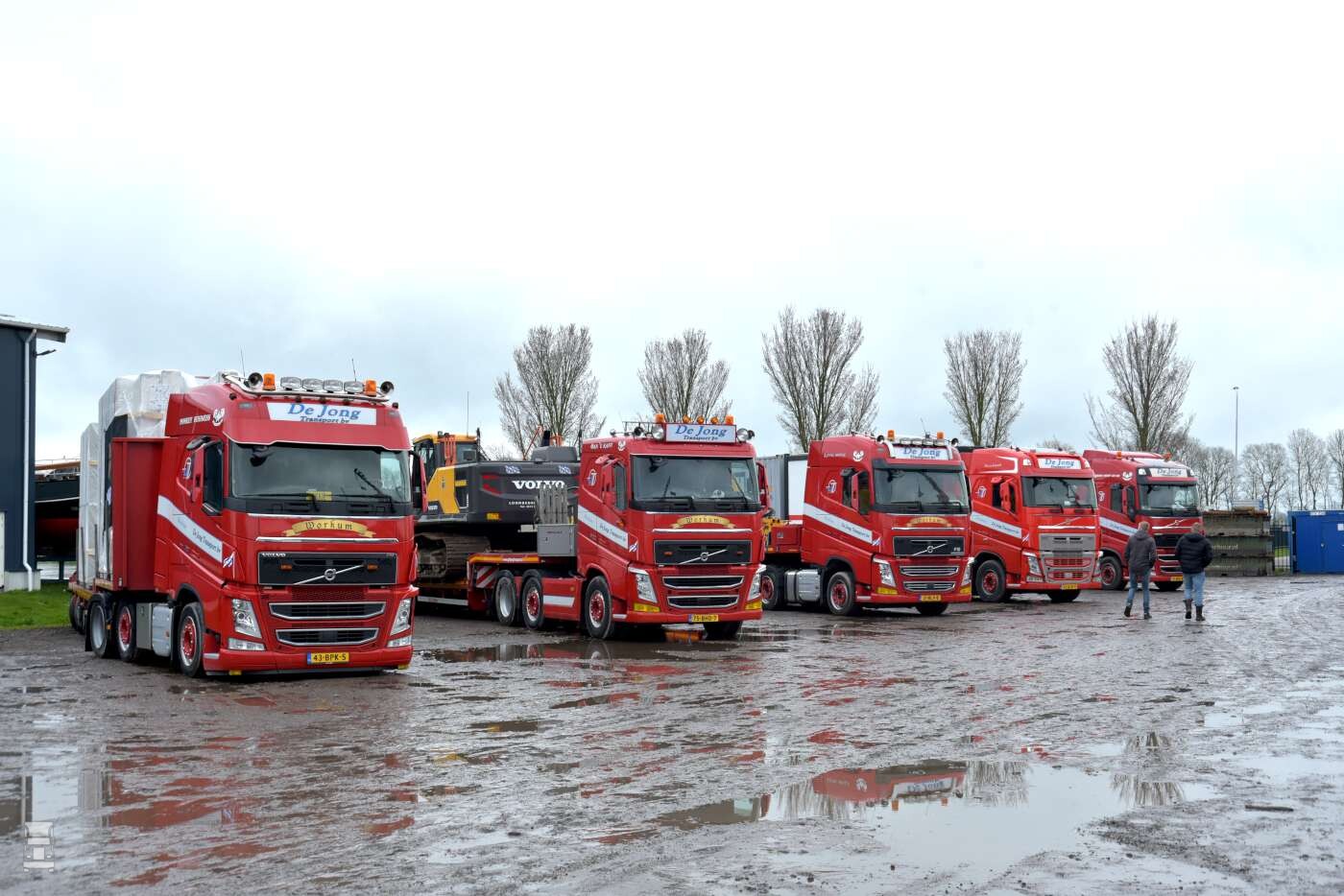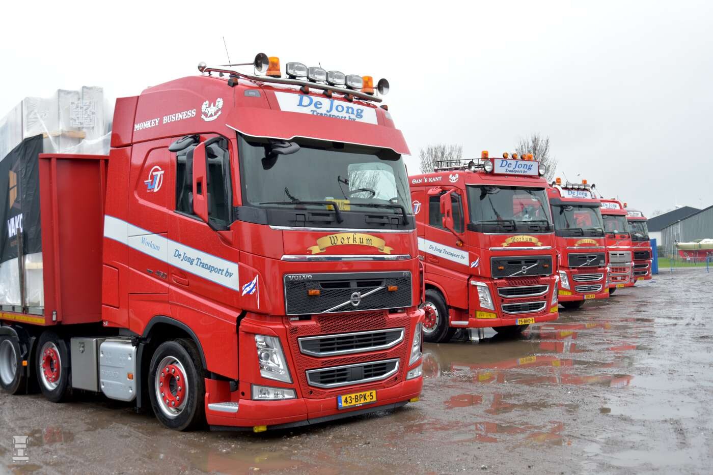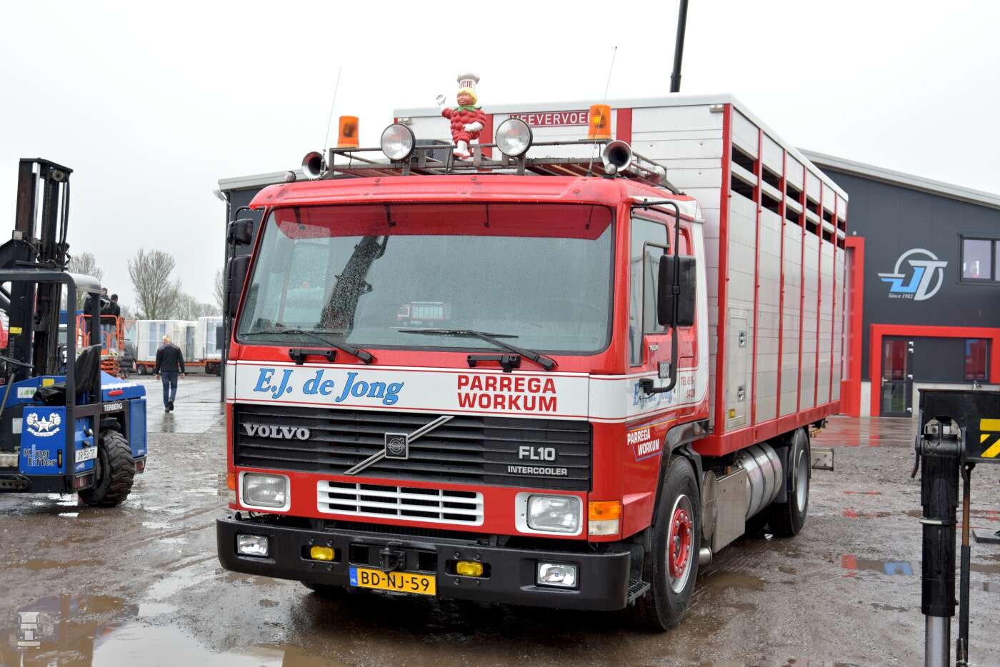 In 1996 werd de eerste nieuwe truck aangeschaft, een Volvo FL10 bakwagen met slaapcabine. De truck werd voorzien van een afzetsysteem met een zelfgemaakte veebak en een platte bak voor het vervoer van stro en dergelijke. De Jong handelt namelijk ook in stro, maar ook in export aardappels, kuil en balen zaagsel. Het grappige is dat een zelfde oude Volvo onlangs terug werd gekocht, waarna hij helemaal gerestaureerd werd. Tijdens de opening staat een oude FL10 trots voor de deur te glimmen. Dit was ooit de tweede nieuwe truck die het bedrijf kocht. Overigens is die truck niet alleen voor de show aangekocht. Het is de bedoeling dat de oude Volvo gewoon wordt ingezet voor het transport van de fourage producten van De Jong. Om die reden is hij ook geschikt gemaakt voor een Kooi- Aap.