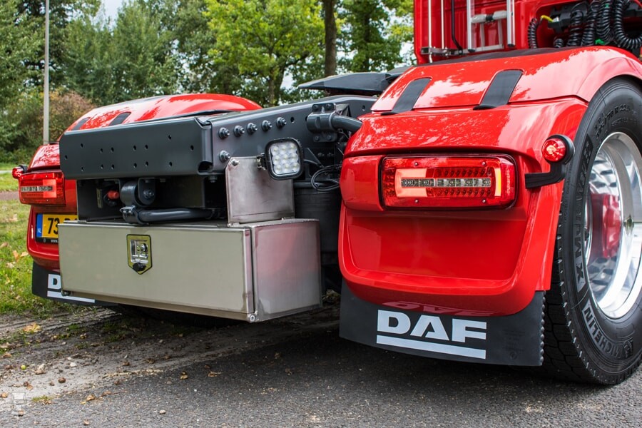Douwes de Wagt heeft goed nagedacht, het ziet er niet alleen mooi uit, het is ook heel praktisch wat hier op de weg is gezet. Let op de opvallende, niet originele zonneklep en op de subtiele LEDjes voor de dakairco. De luchthoorns maken de cabine heel mooi af.