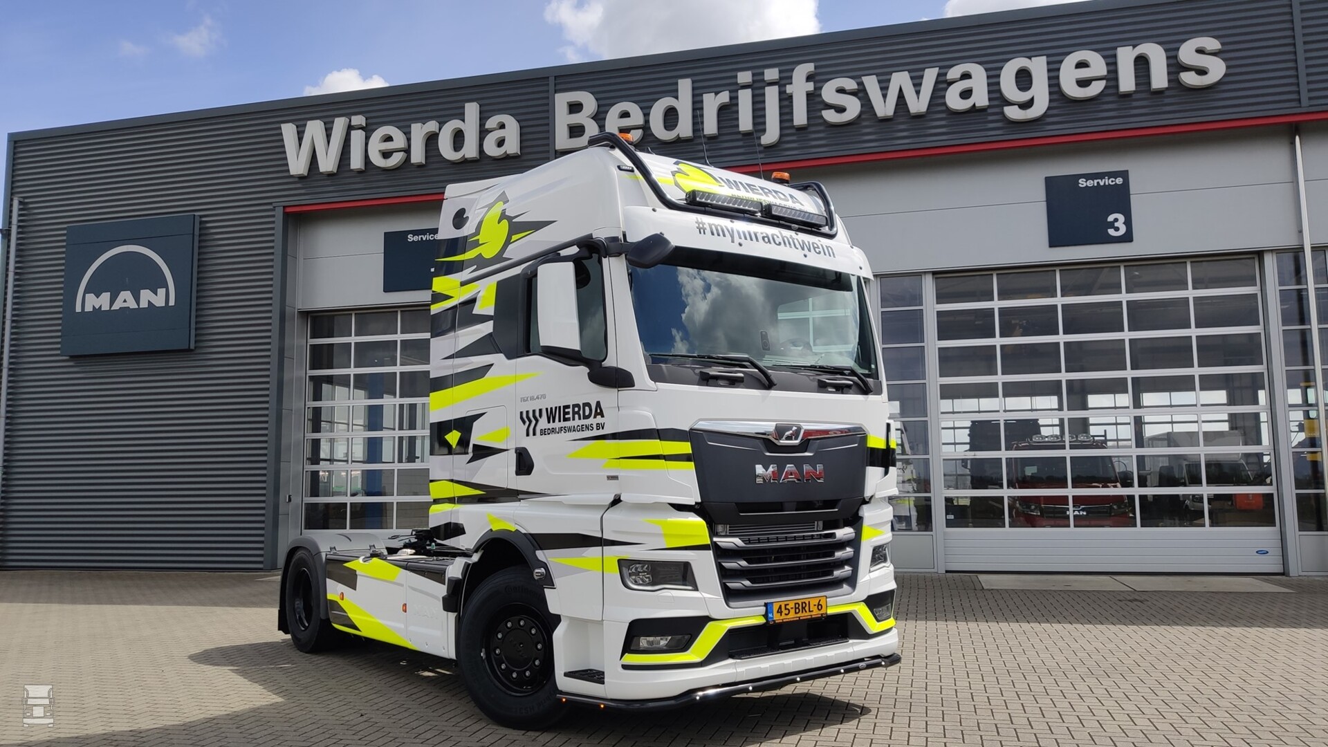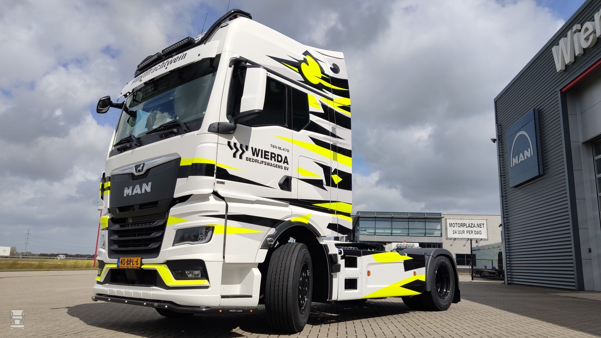 De nieuwe MAN TGX kennen we tot nu toe vooral in de gouden introductie kleuren maar bij Wierda Bedrijfswagens vonden ze het tijd worden voor een frisse look. De nieuwe demo, een 18.470 met de GX cabine werd voorzien van een op zijn minst opvallende striping!