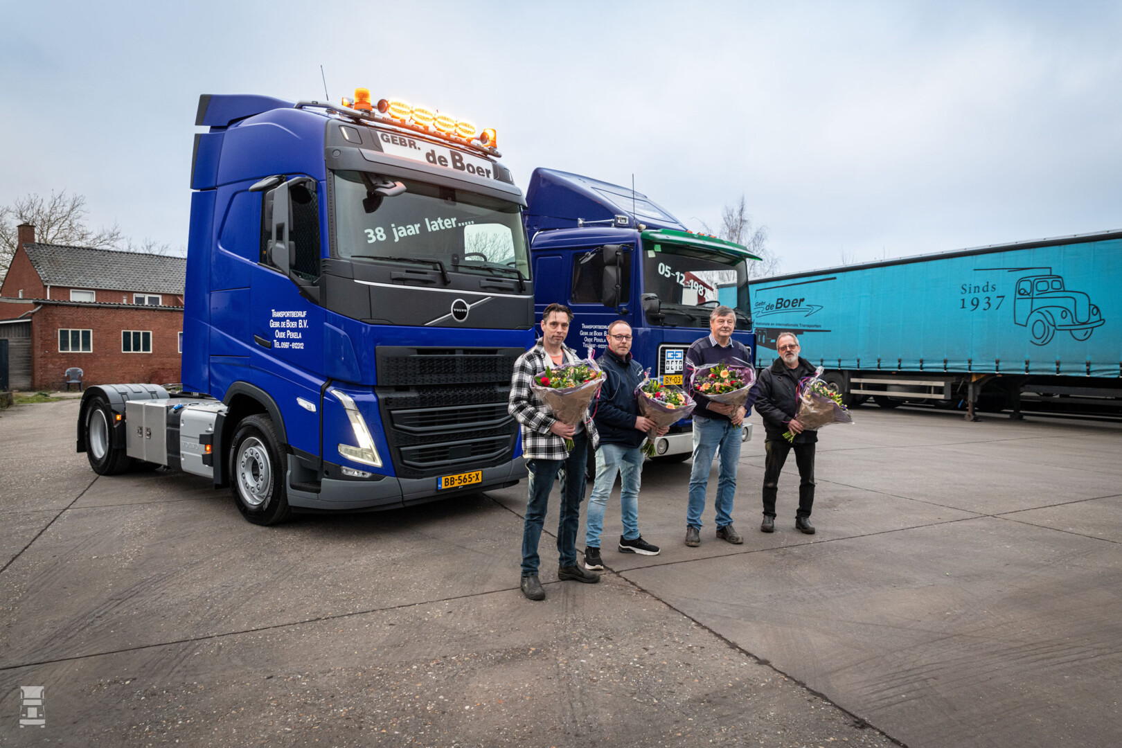 Bij de aflevering stonden de jongste en oudste Volvo-truck letterlijk naast elkaar. “Het is bijzonder om 38 jaar later exact op dezelfde dag een nieuwe Volvo FH te mogen ontvangen”, vertelt Martijn de Boer, samen met zijn broer Rinke eigenaar van het bedrijf. “Dat de Volvo F10 nog steeds in onze showroom staat, maakt het extra speciaal. Tijdens de aflevering werd hier symbolisch bij stilgestaan. Op de cabine van de Volvo FH stond de tekst ‘38 jaar later…’, terwijl op de F10 de originele datum 5-12-1987 was vermeld. Leuk detail: onze chauffeur Henk rijdt met de nieuwe truck en hij is toevallig ook 38 jaar bij ons in dienst. Dat kwam allemaal mooi samen bij de aflevering van deze truck.”