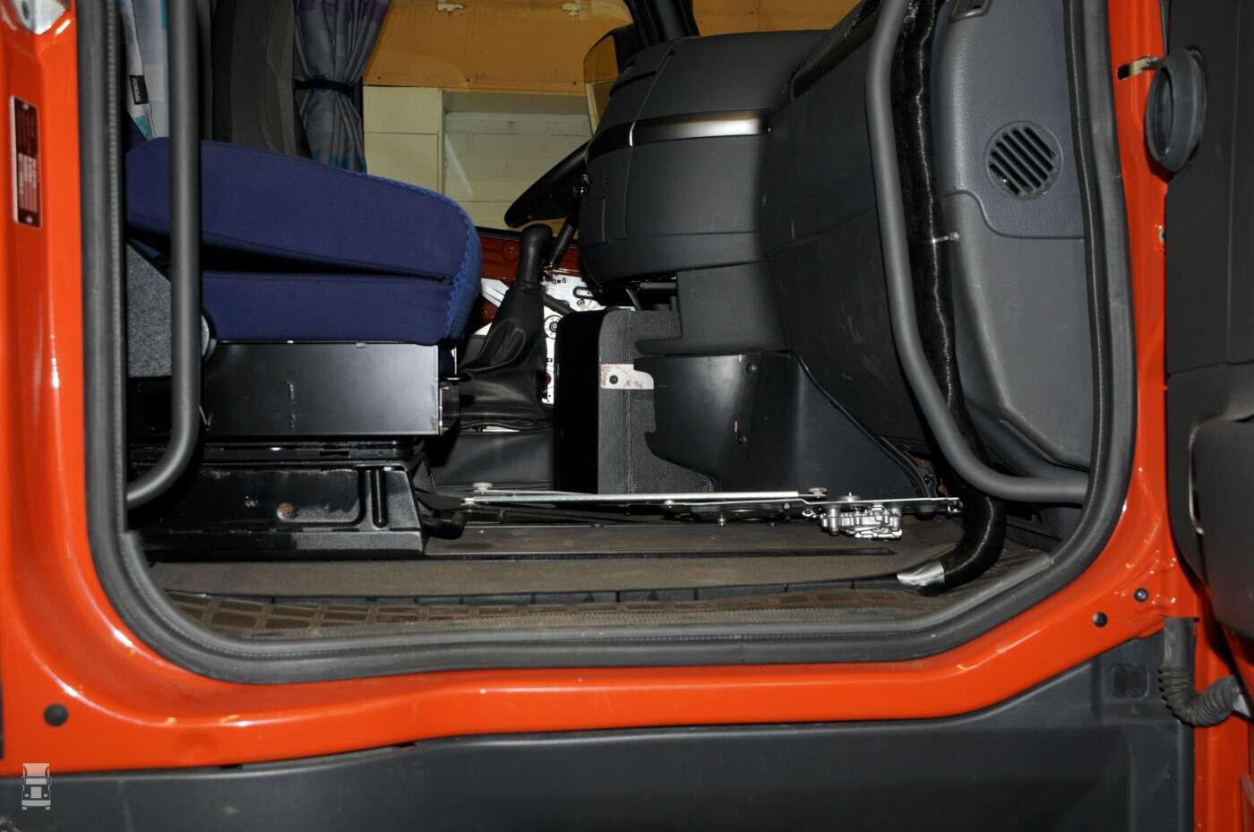 De FH12 trekker die je hier ziet heeft boven de grille een extra groot vlak, en dat verraad de extra hoogte van de cabine. Ook zie je dat de deurverlengers niet meer aansluiten op de spatborden. Het stukje achter de deur is al wel aangepast trouwens. In het interieur zien we de vlakke vloer, want je kijkt zonder motortunnel zo aan de versnellingspook toe. Jazeker, dit 2005 model was nog voorzien van een manuele transmissie en dat is merkwaardig, want de I-Shift was toen ook al ingevoerd.