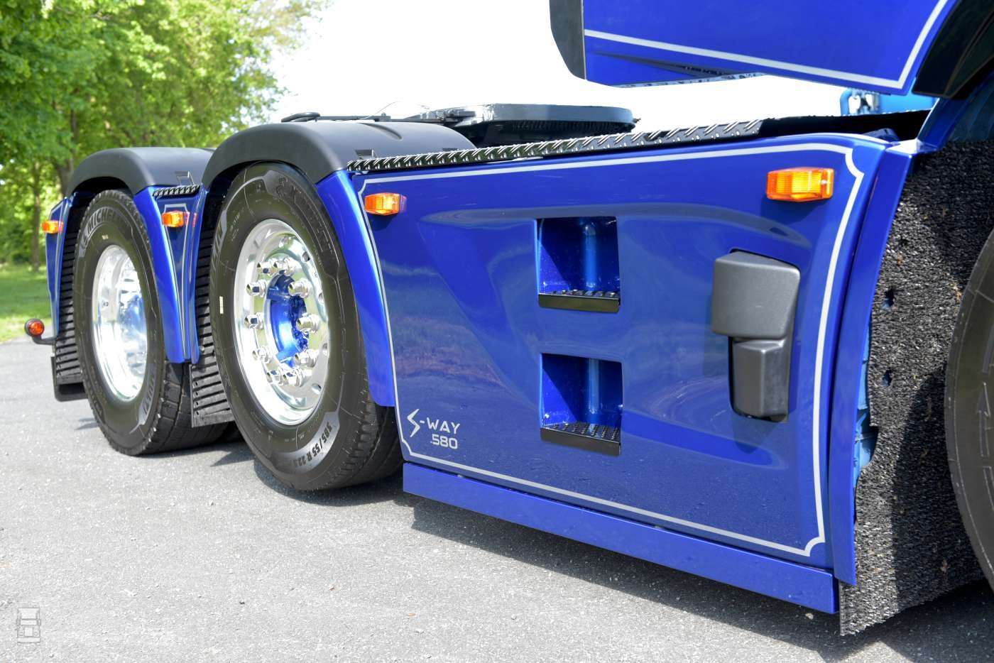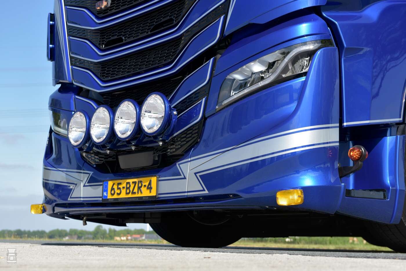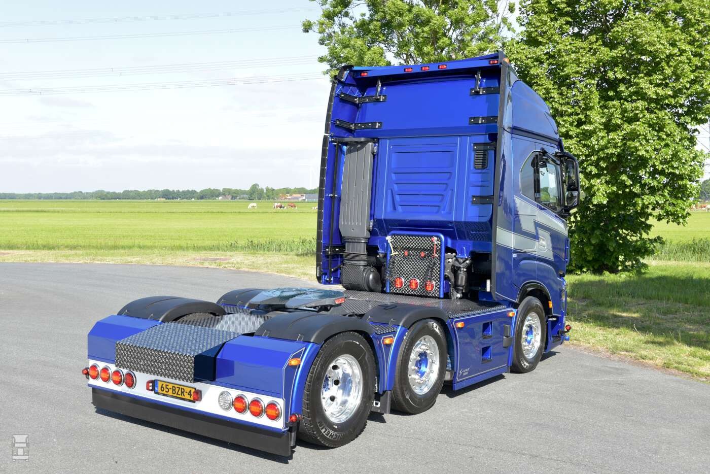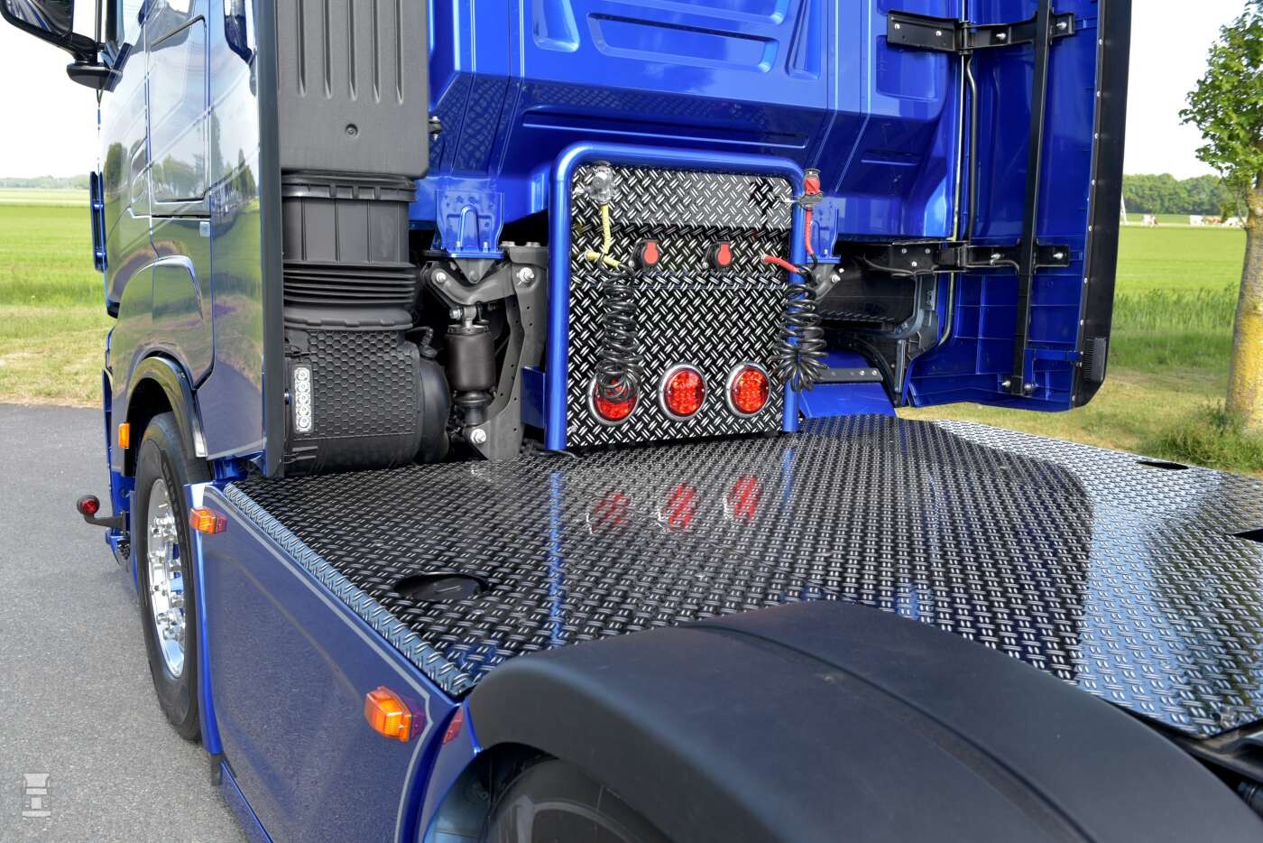 In overleg met de dealer werd de, volledig lucht geveerde trekker opgebouwd door SR Truckopbouw in Meeden met een vlonder, een topbalk met verlichting en met zijskirts van Veap Shield. SR maakte ook de achterbumper en bouwde de accessoires van Go-in-Style op zoals de zonneklep en de windkappen op de hoeken van de cabine. Verder werd er een lichtbak gemonteerd met verstralers en zwaailampen en werd er extra verlichting aangebracht. Uiteraard is alles apart in schakelbaar. Het bijzonder fraaie spuitwerk en de afwerking met blanke lak werden uitgevoerd door A. van Dis en Maurits in Bedum. Een glanzende set Alcoa wielen maakt het plaatje af.