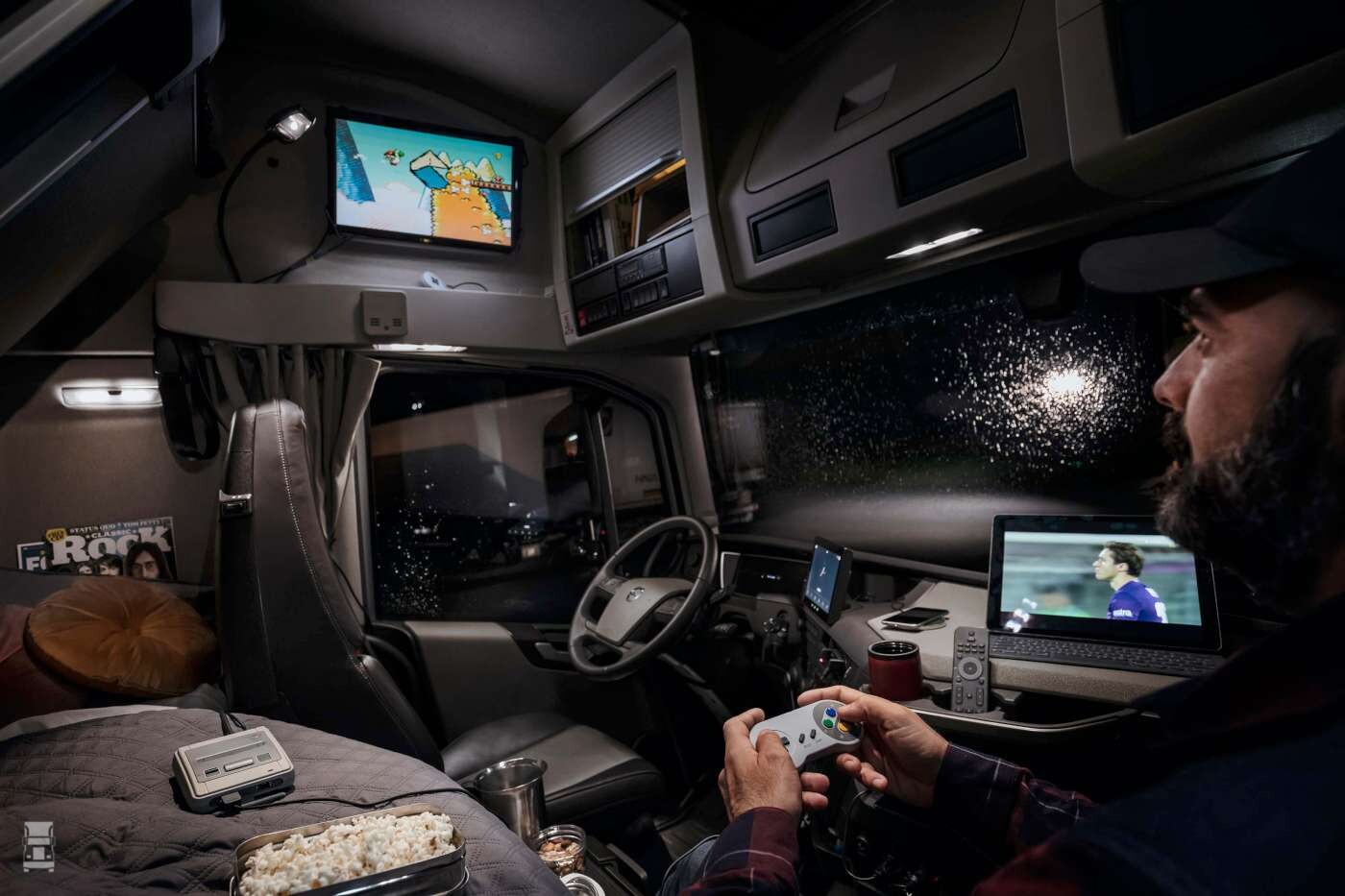 Moderne cabines hebben vaak een deel van het bed wat omhoog kan. Je kunt dan heel relaxed even wat lezen, tv kijken of met je tablet of laptop aan de slag. Het rare is echter dat alle truckfabrikanten dat aan de verkeerde kant van de cabine inbouwen.