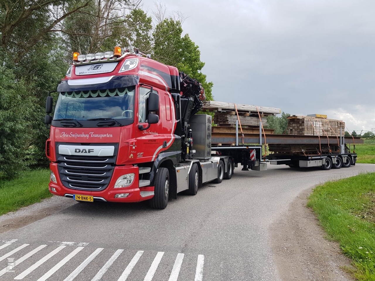 Johan Swijnenburg rijdt met een fraaie nieuwe combinatie. De DAF CF 480 Space Cab uit 2019 heeft vier assen en een Fassi F710RA.2.28 kraan (71 ton/meter), standaard uitschuifbaar tot 20 meter, maar aangevuld met een Jib tot 30 meter. Hierachter een op maat gespecificeerde Pacton drie-assige, gestuurde uitschuifbare semi-dieplader (type SYD.348.L-U). De lange trekker met kraan blijft met de ingeschoven oplegger erachter (van 10,7 meter lang) precies binnen de wettelijke eisen. Voor lange, ondeelbare lading kan de semi-dieplader 4,5 meter uitgeschoven worden, waarmee de combinatie 22 meter lang wordt.
