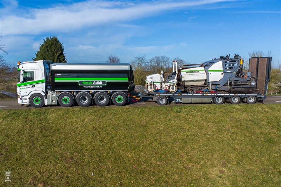 Pauw Handel en Transport nam twee Scania 500G Quadro kippers in gebruik. De 10x4 kippers zijn extra compact uitgevoerd, zodat ze gekoppeld aan een diepladeraanhangwagen een complete asfaltset op locatie kunnen afleveren. De vangmuil is op exact acht meter van de voorbumper gemonteerd. Hierdoor kunnen ze gekoppeld worden aan een 10,75 meter lange aanhangwagen van GS Meppel en toch binnen de wettelijke totaallengte blijven.