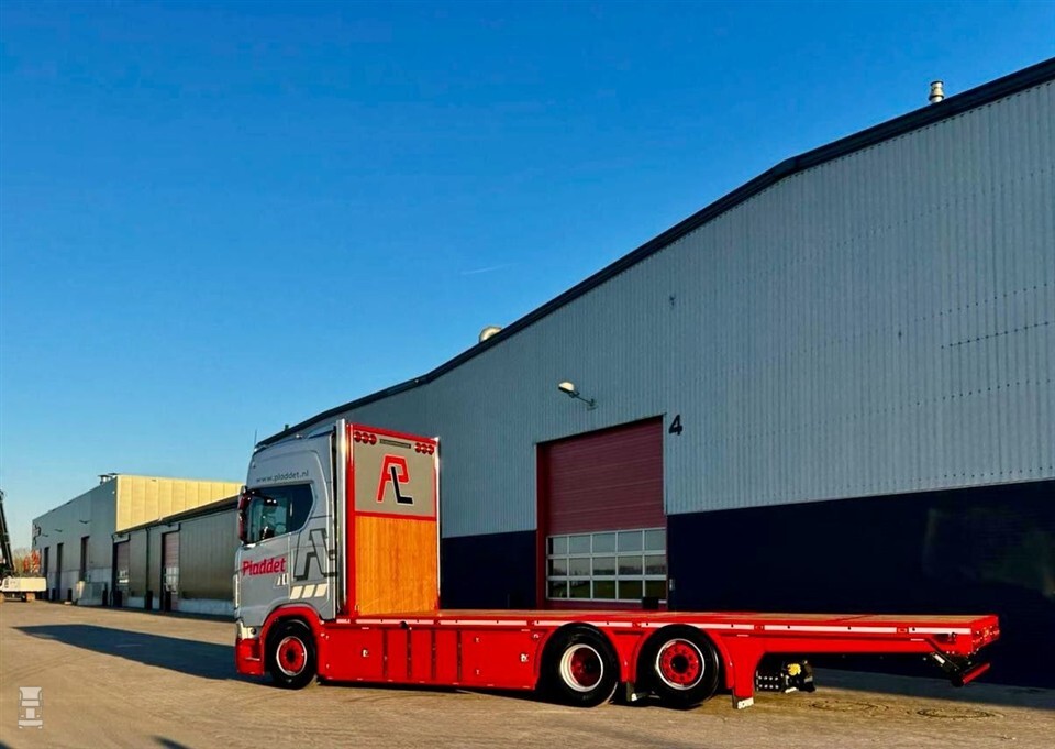De felrode onderpartij staat mooi bij de zilvergrijze cabine, waar groot het logo van Pladdet op is aangebracht. Op het dak is een lichtbeugel gemonteerd met zes verstralers. Achter de cabine verrijzen twee flinke staande uitlaten, die mooi combineren met het speciale kopschot. Deze is fraai afgewerkt met hout en extra verlichting. Ook onder de gereedschapskisten is verlichting weggewerkt.