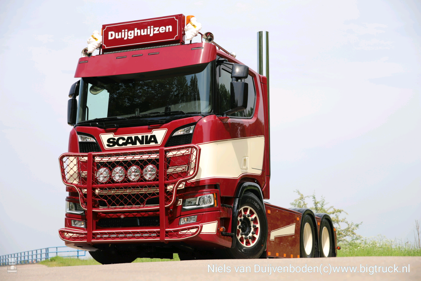 Duijghuijzen Handel en Transport uit Druten heeft vanmiddag de sleutels van een wel heel opvallende Scania R650 met plat dak in ontvangst genomen. Dit is de eerste in Nederland geleverde auto met dit cabinetype. De R650 is bij Erjo Truckstyling opgebouwd en aangekleed. Aan de achterzijde is er tussen de staande uitlaten een vlakke plaat gemaakt met het logo er verlicht tussen. En de op maat gemaakt achterbumper is deels rond gemaakt. Echt een stukje vakwerk. Verder zijn er een wildrek en een dakrek gemonteerd. En het hele geheel is gespoten in de rood creme huisstijl van de firma. Wij van BIGtruck wensen Theo en Jeroen van Duijghuijzen veel veilige km's met de nieuwste aanwinst.