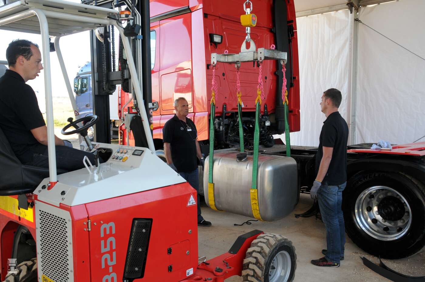 Grappig bij deze test is dat Mercedes er voor koos om de brandstoftanks te wegen voor een verbruik-meting. Dat is minstens zo precies als aftanken en temperaturen, en bovendien werkt het sneller dan je denkt. Drie man sleutelen sneller een tank van een truck dan dat je hem bij kunt vullen!