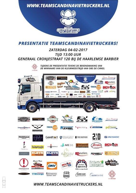 Op 04 februari 2017 wil 'Team Scandinavietruckers', in samen werking met de Haarlemse Barbier, het truckteam presenteren in de Generaal Cronje straat 120 te Haarlem. De truck zal maximaal 2 uur voor de deur van de winkel van de Haarlemse Barbier blijven staan. Rond de klok van 13.00 uur zal deze presentatie op dit adres plaatsvinden.