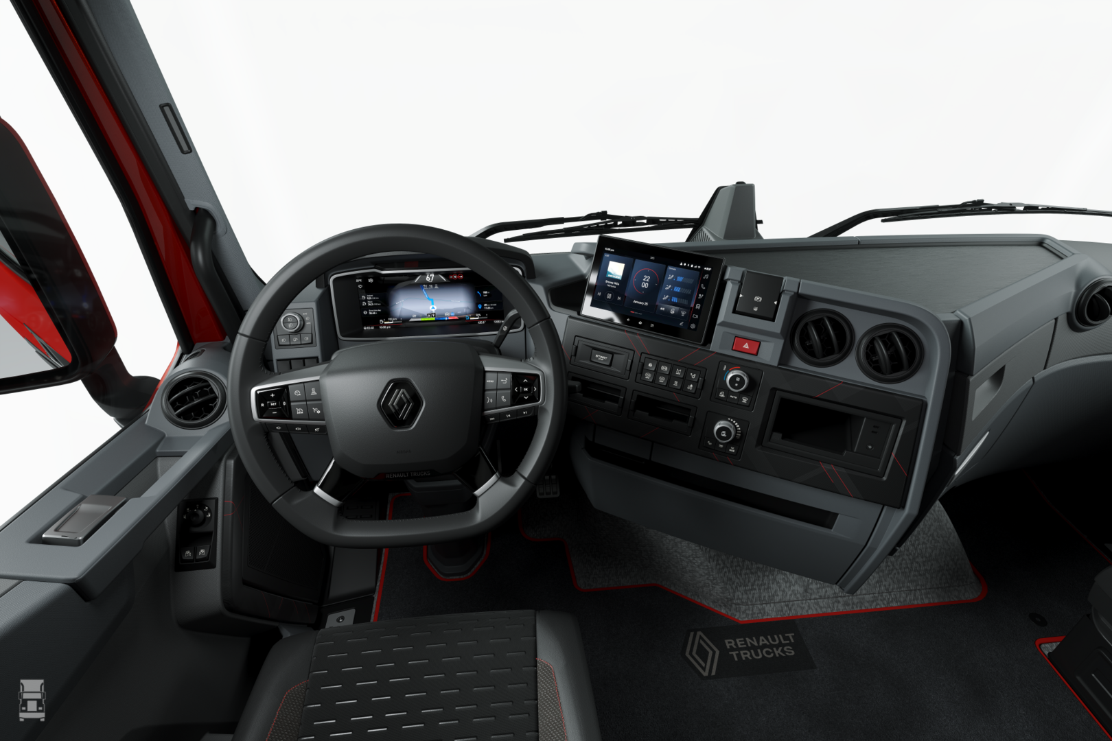 Het nieuwe stuurwiel is niet meer rond maar D- vormig. Het kan worden voorzien van een lederen afwerking. Het nieuwe kleinere stuurwiel met afgeplatte onderzijde geeft meer bewegingsvrijheid voor de chauffeur achter het stuur. De stoelen en het dashboard van de Renault Trucks T, T High, C & K kunnen naar eigen wens gepersonaliseerd worden. De stoelen kunnen worden uitgerust met volledige stoffen bekleding of worden uitgevoerd in halfleder in combinatie met stof. Voor het dashboard is er een keuze uit een compact of een panoramisch dasboard met een afwerking in antracietgrijs of zwart met rode accenten. De volledig elektrische Renault Trucks E-Tech T & C modellen hebben een eigen opvallende afwerking in een blauw met rode kleurstelling.