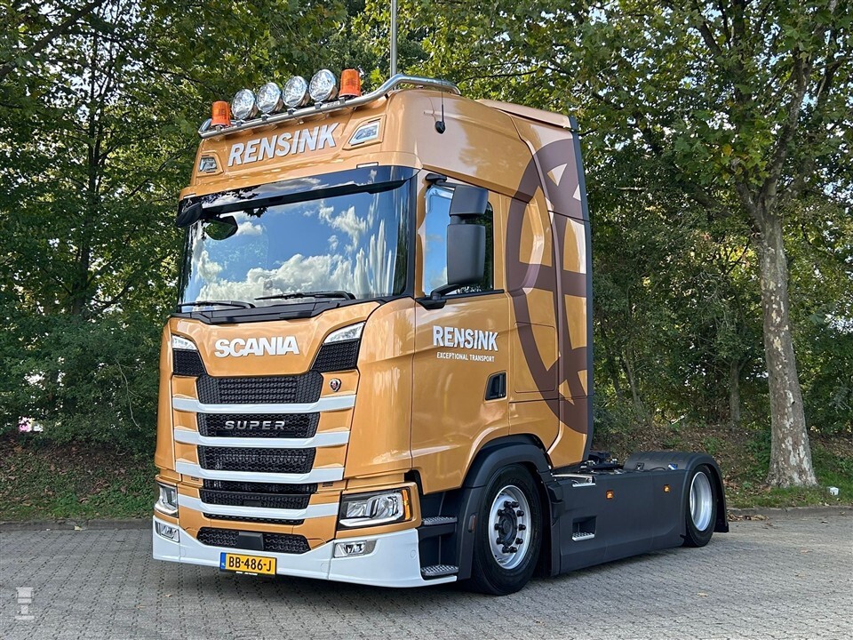 Het is alweer de tweede Scania R500 4x2EB 20 Highline Mega die Rensink mag ontvangen. De trekker staat erg laag op de kleine wielen, wat toch altijd weer een bijzonder gezicht is. Een echte lowrider! Met het hoge Highline-dak en in de bedrijfskleuren van Rensink staat hier echter weer een mooie Scania. Uiteraard konden ook zwaailampen en verstralers op het dak niet ontbreken.