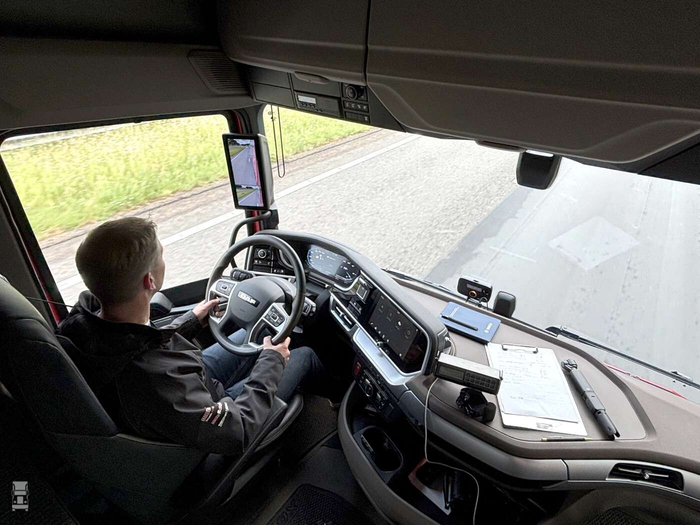 Tijdens die rit raakten we diep onder de indruk van het comfort in de DAF XG+ cabine. De motor draait dankzij de 1:205 achteras reductie net boven de 900 toeren en daarbij is hij zo stil dat we ons zelf in een touringcar waanden. Daar komt dat ronduit unieke ruime interieur nog bij, net als het onovertroffen zicht rondom.