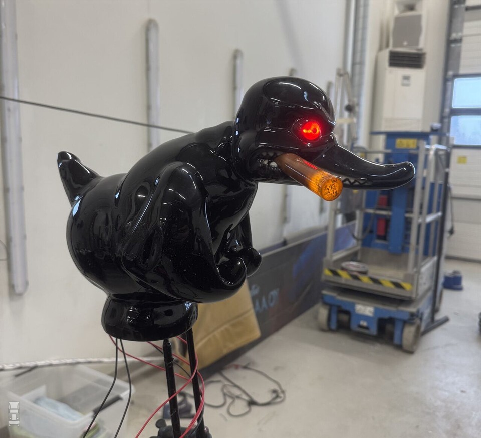 Speciaal voor Clausen werden twee stoere eenden gemaakt met een 3D-printer. De zwarte eenden, met Scania-kroon, kijken dreigend de wereld in en hebben hun vleugels gebald. In de snavel, tussen de tanden geklemd, zit een flinke sigaar. De creatievelingen van Bolt-On Solutions gingen echter nog een stapje verder en bouwden verlichting in de eenden. Hierdoor lichten de ogen en ook het puntje van de sigaar op in het donker.