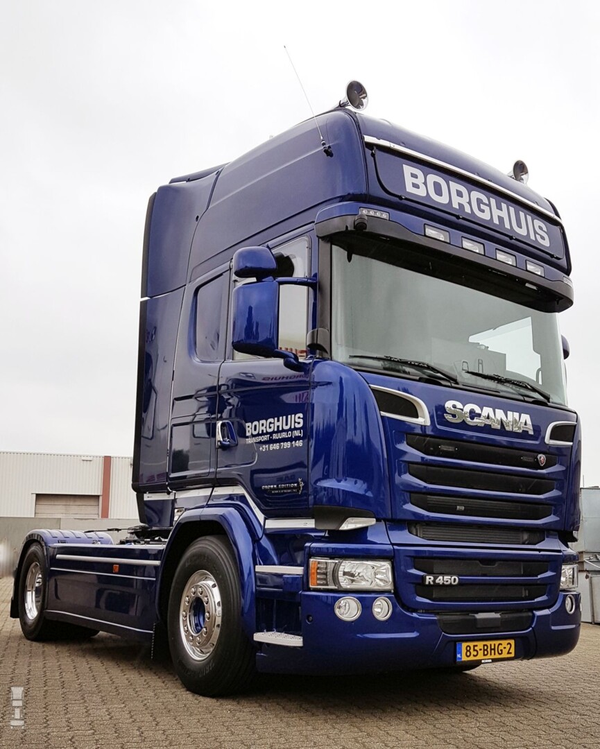 Recent ruilde Freddy Borghuis uit Ruurlo zijn geliefde Scania Red Passion met de machtige 580 pk V8 motor in voor een R450 Topline LA4x2MNB Crown Edition. En niet zo maar één. Freddy wist precies wat hij wilde: een ingetogen mooie truck in zijn eigen bedrijfskleur saffier blue metallic. Daarbij keek hij zowel naar de veiligheid, de economie als het comfort. Als één van de eersten in Nederland heeft hij voor de truck een contract afgesloten met flexibel onderhoud.