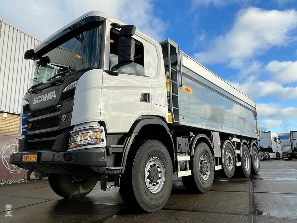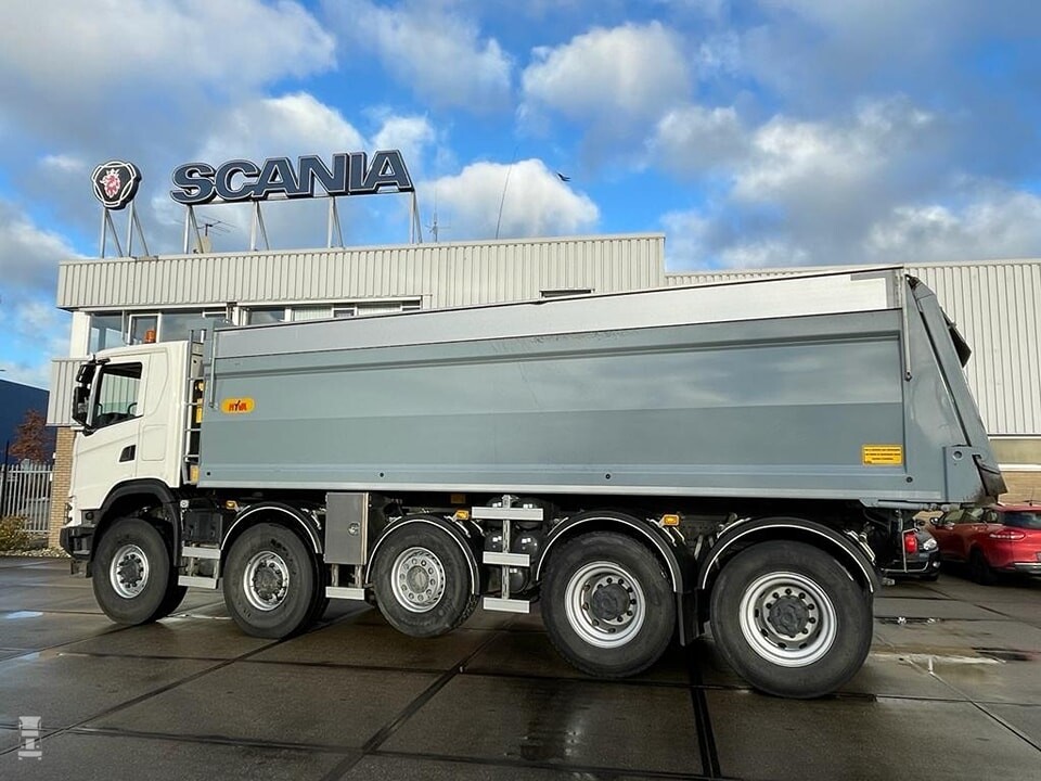 Scania bouwt zelf de 10x8 niet af fabriek maar dit exemplaar werd omgebouwd door Veldhuizen Trucks. De af- fabriek 8x8 werd voorzien van een extra, sturende en liftbare derde as en hogere wielen voor meer bodemvrijheid. Dankzij de extra as heeft deze Scania 50 ton op kenteken, en dat resulteert in 30 ton nuttig laadvermogen. De truck werd geleverd door Scania Groningen.