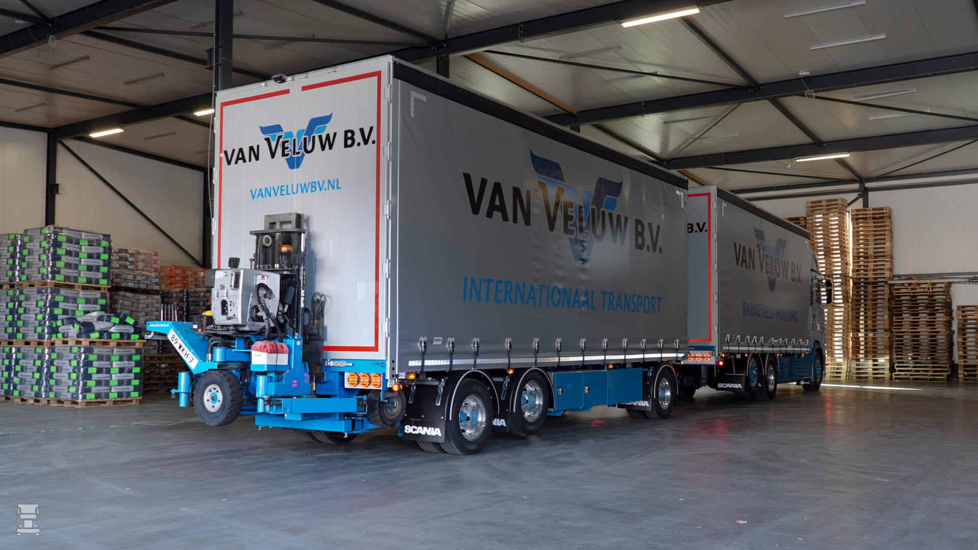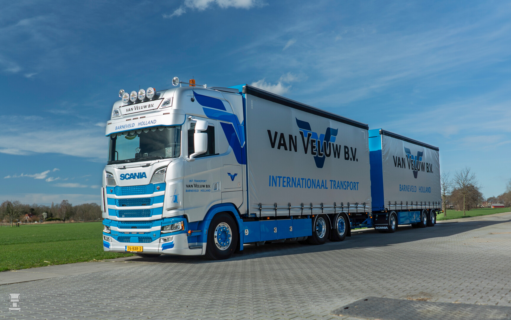 Voor het bijna 65-jarige transportbedrijf is het ook de eerste Scania in hun wagenpark. Mede-directeur Dirk- Jan Hazeleger wilde altijd graag een Scania kopen en als je dan toch in een combinatie investeert, moet het ook maar gelijk goed was hun beide visie; een echte V8 met een schamelaanhanger. De motorwagen is 530pk sterk, met een ruime S-cabine. Truckstyling Lunteren heeft hem voor chauffeur Maarten van den Dool gecustomized, met onder andere een met leer bekleed bed en hemel.