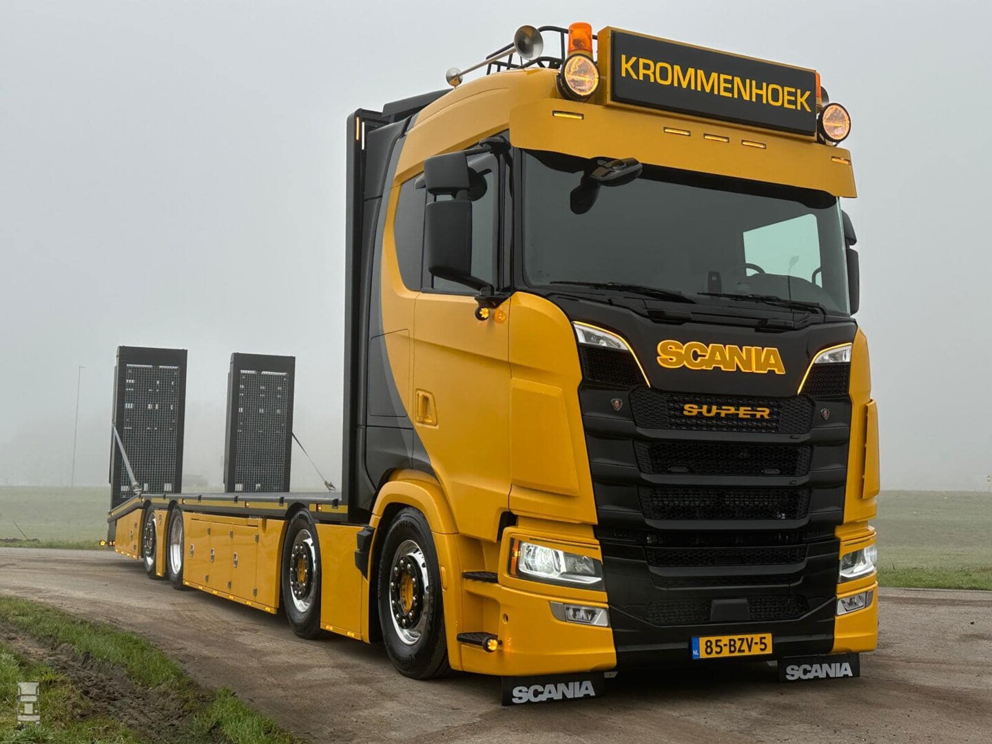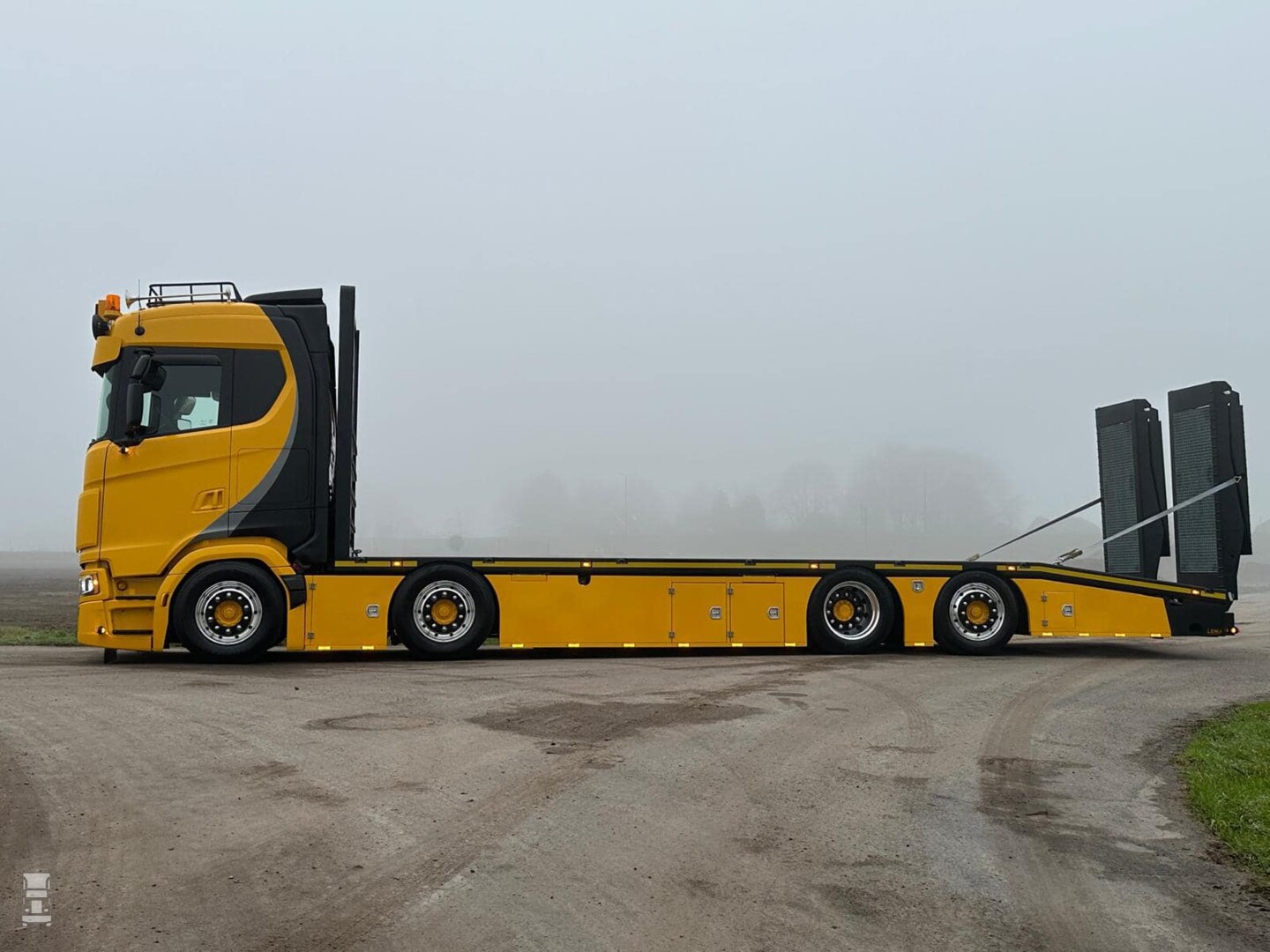 De Scania 560S is voorzien van de Scania Super aandrijflijn. Geen V8 deze keer dus. Het lange 8x2 chassis is voorzien van een oprij laadbak met een afgeschuinde achterkant en dubbel vouwende oprijkleppen. Daardoor is de oprij hoek minimaal, waardoor vrijwel iedere machine probleemloos geladen kan worden.