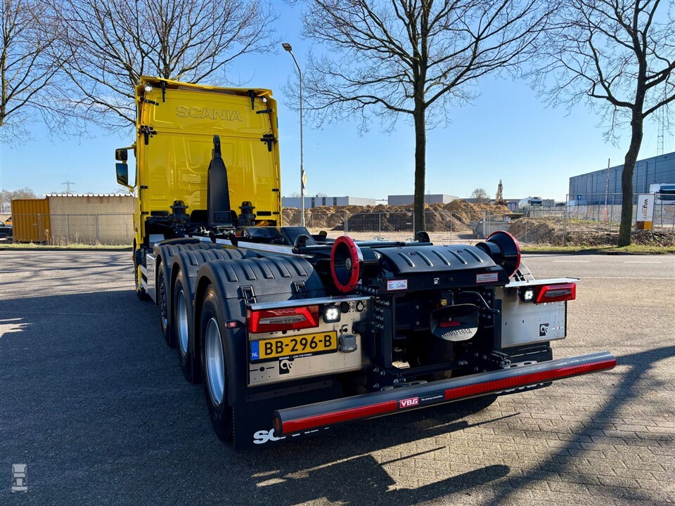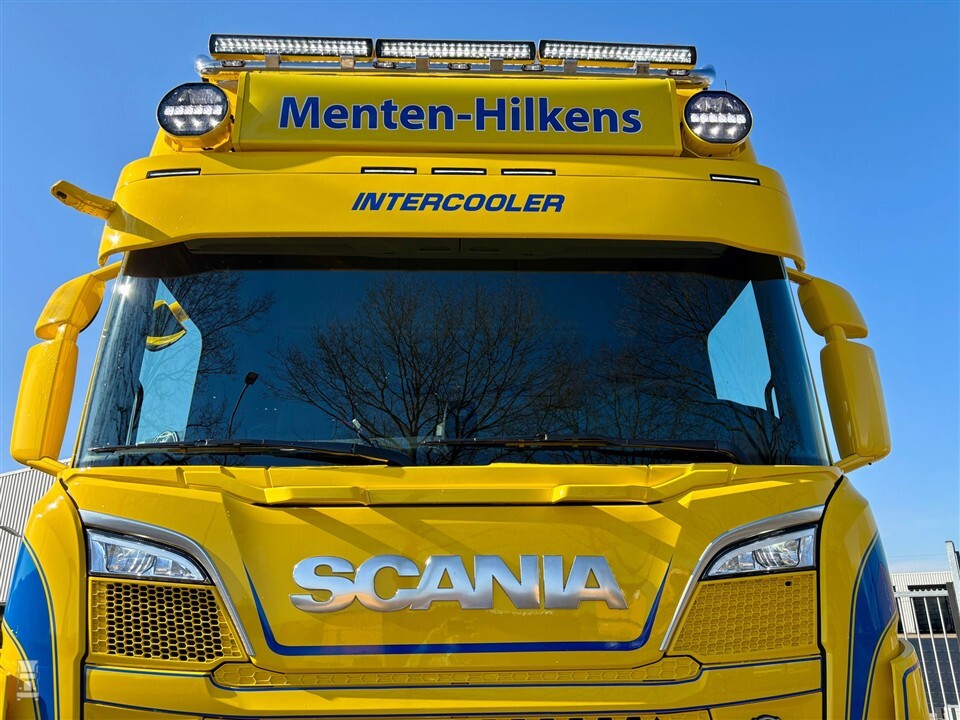 Officieel heeft de nieuwe vrachtwagens van Menten-Hilkens Scania 770R B8x2/4NB CR20H V8. Een hele mond vol, maar hiermee beschrijf je dan ook een heel stoere vrachtwagen. Dit beperkt zich niet tot Scania’s meest krachtige motor onder de cabinevloer. Alles aan de vierasser is stoer, van de uitgebreide extra verlichting tot het opvallende spuitwerk.