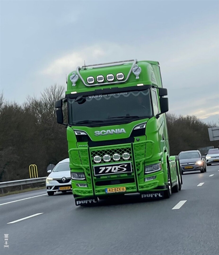 De keuze viel uiteindelijk op een Scania 770S V8 in een lekker kleurtje. Dankzij de oersterke maar nieuwe V8-motor mag deze nog een jaartje of vijf de binnensteden in. Met zijn felgroene lak, grote bullbar en extra verlichting zal deze trekker hier zeker opvallen. Het is niet direct de eerste keuze waar je aan denkt bij een milieuvriendelijke vrachtwagen, maar het oog wil ook wat. En je kunt zeggen wat je wil, maar groen is deze Scania zeker!