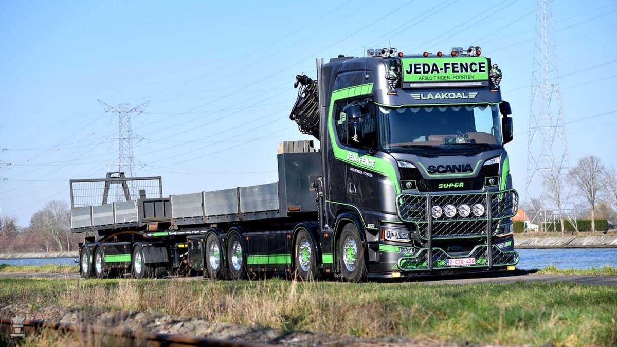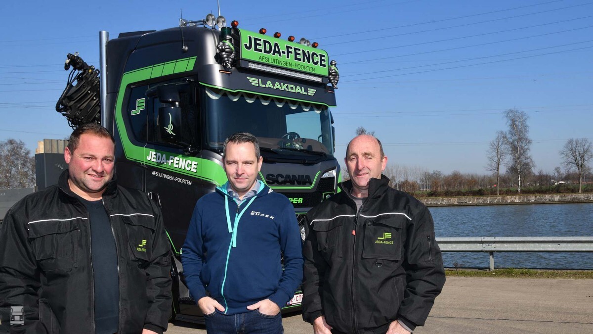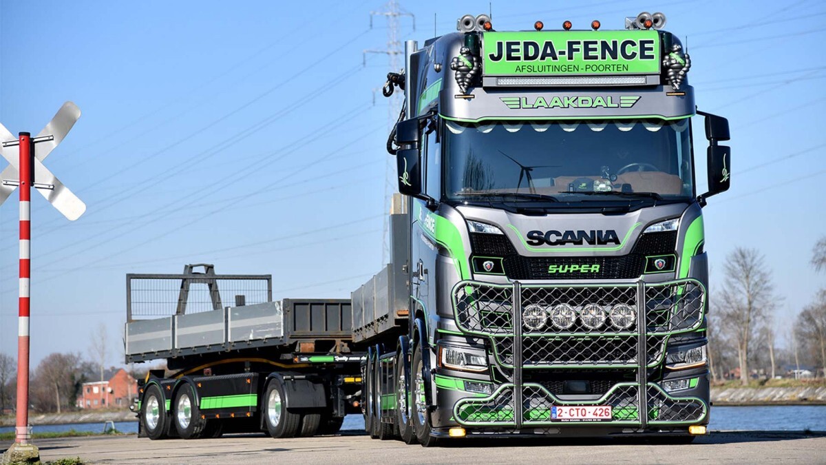 Jeda-Fence uit het Belgische Laakdal is al vijftien jaar lang gespecialiseerd in het maken en plaatsen van hekken en poorten op maat, vooral bij B2B-klanten. Naast een vloot met bestelwagens voor de plaatsingsploegen heeft het bedrijf ook een vrachtwagen in dienst. “Die dient niet enkel om het materiaal te leveren, maar is meteen ook het uithangbord van de zaak,” zegt Jef Dauwen, die Jeda-Fence oprichtte. “Daarom gaan we ook altijd voor bijzondere modellen, zoals onze nieuwe Scania 770 S. En deze is extra speciaal, want we bestelden hem als cadeau voor de zestigste verjaardag van mijn vader, die onze vaste chauffeur is!”