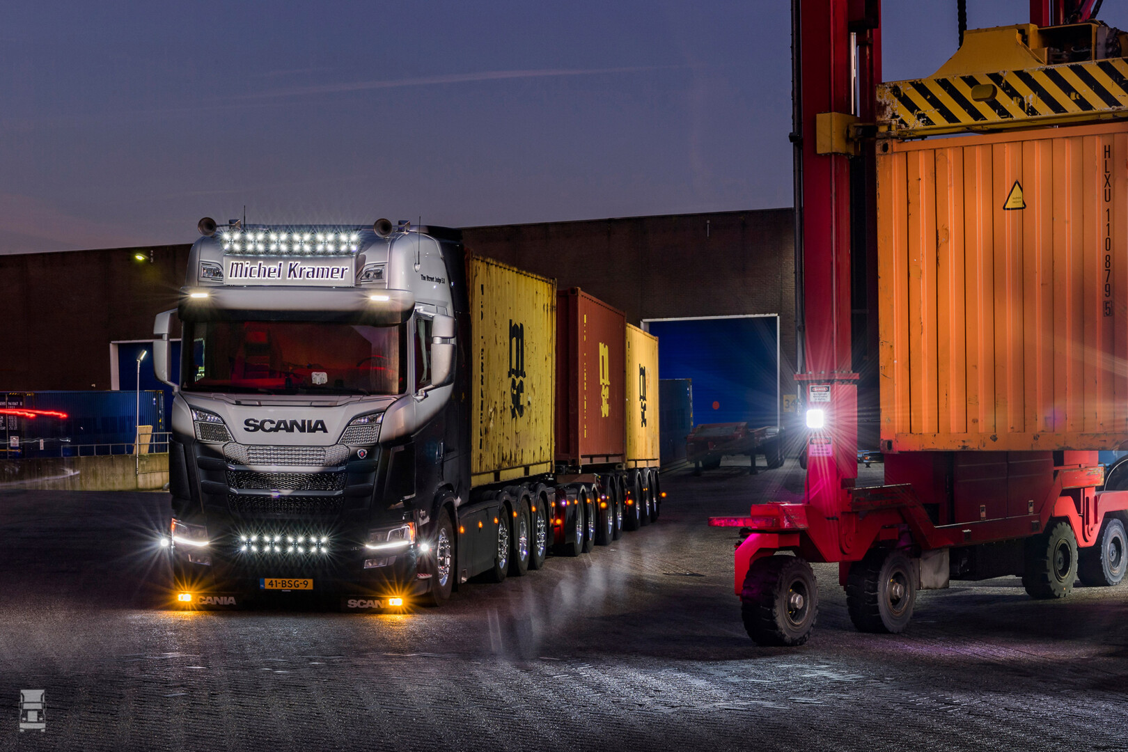 Hij zal er zelf nauwelijks op rijden, maar toch wilde hij de dikste V8 die Scania te bieden heeft. Dat Michel Kramer altijd voor Scania’s met een V8 gaat, is bekend. Zijn andere twee voertuigen zijn ook uitgerust met Scania’s 16-liter motor. “Maar dat zijn trekkers, dit is een bakwagen met een gestuurde voor- en naloopas”, vertelt Michel. “Dat komt omdat we deze auto in combinatie met een dolly en een vijfassig Broshuis chassis gaan inzetten als LZV in de containers. Want dat is ons werk. Wij rijden hoofdzakelijk nationaal containers uit de Rotterdamse haven het land in en volle containers voor de export weer terug naar de haven. Daarvoor hebben we bij één van onze klanten zelfs een kleine stradle carrier staan zodat we zelf op en af kunnen zetten. De installatie weegt ook meteen zodat we rederijen het juiste aantal kilo’s kunnen opgeven. Dat is weer van belang in verband met het laadschema van de boot.”
