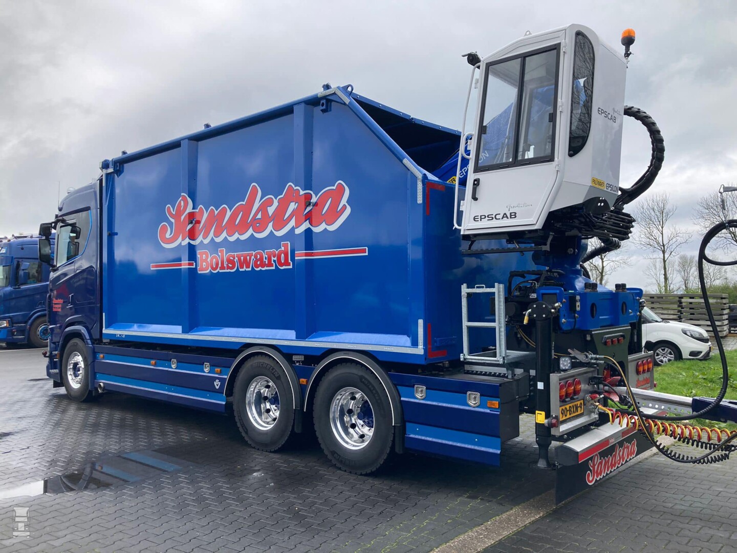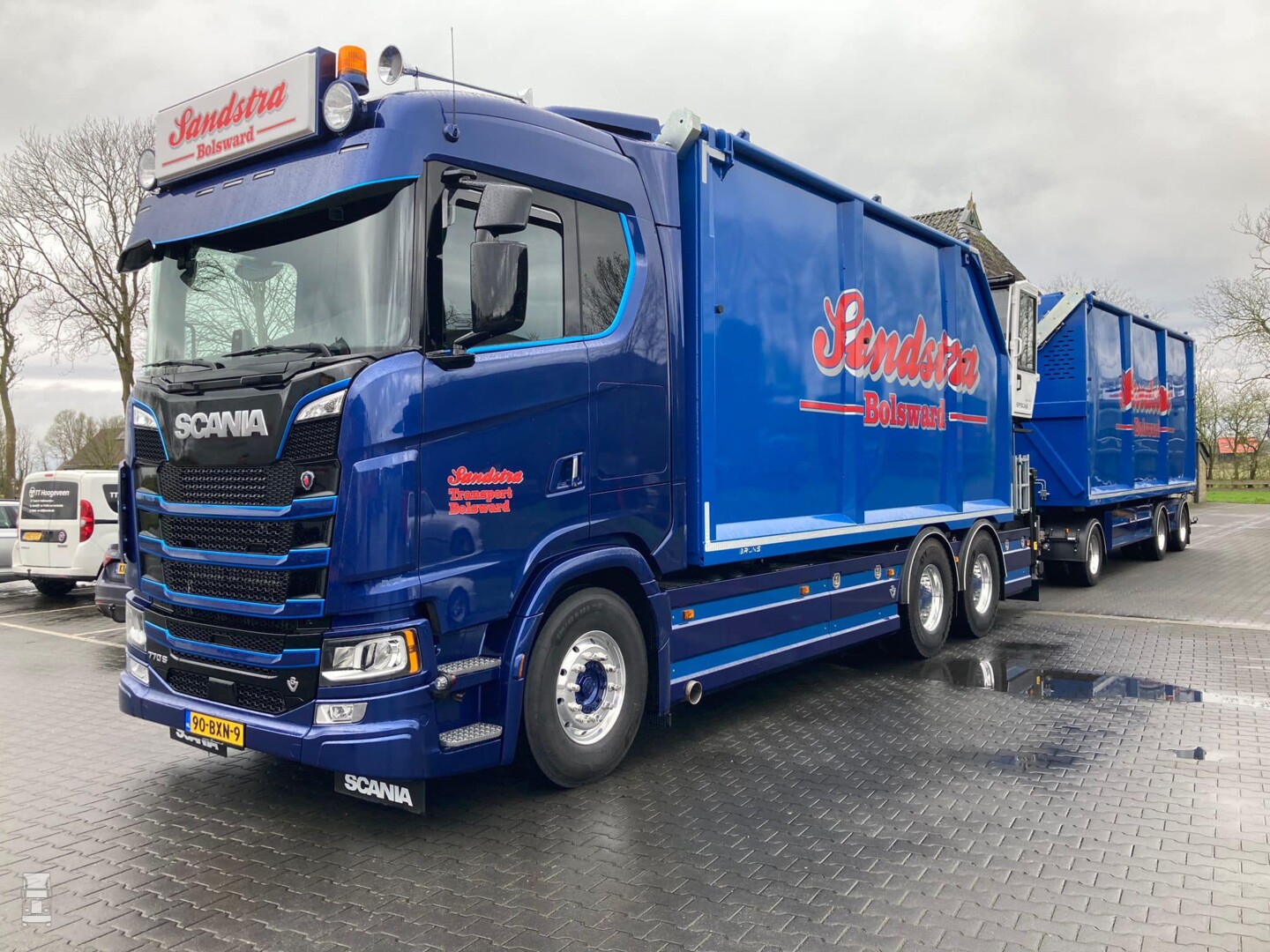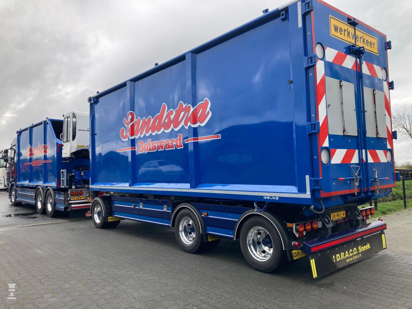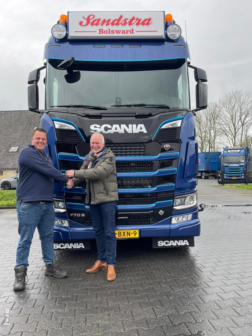 Het heeft even geduurd voordat de Scania bakwagen met de Draco aanhangwagen klaar was, maar inmiddels rijdt hij. Voor Sipke Visser reden om nog een keer naar zijn voormalige werkgever te gaan, om daar de sleutels te overhandigen aan eigenaar Tom Sandstra. De truck is uitgevoerd in 'King of the Road' uitvoering en is voorzien van de nodige extra's. Verder is er een Escab autolaadkraan gemonteerd op de motorwagen. De kiepende Draco Sneek aanhangwagen completeert het span. Alles bij elkaar een schitterende combinatie in de Sandstra kleuren en een mooie afsluiting van de carrière van Sipke Visser bij Rinsma Scania.