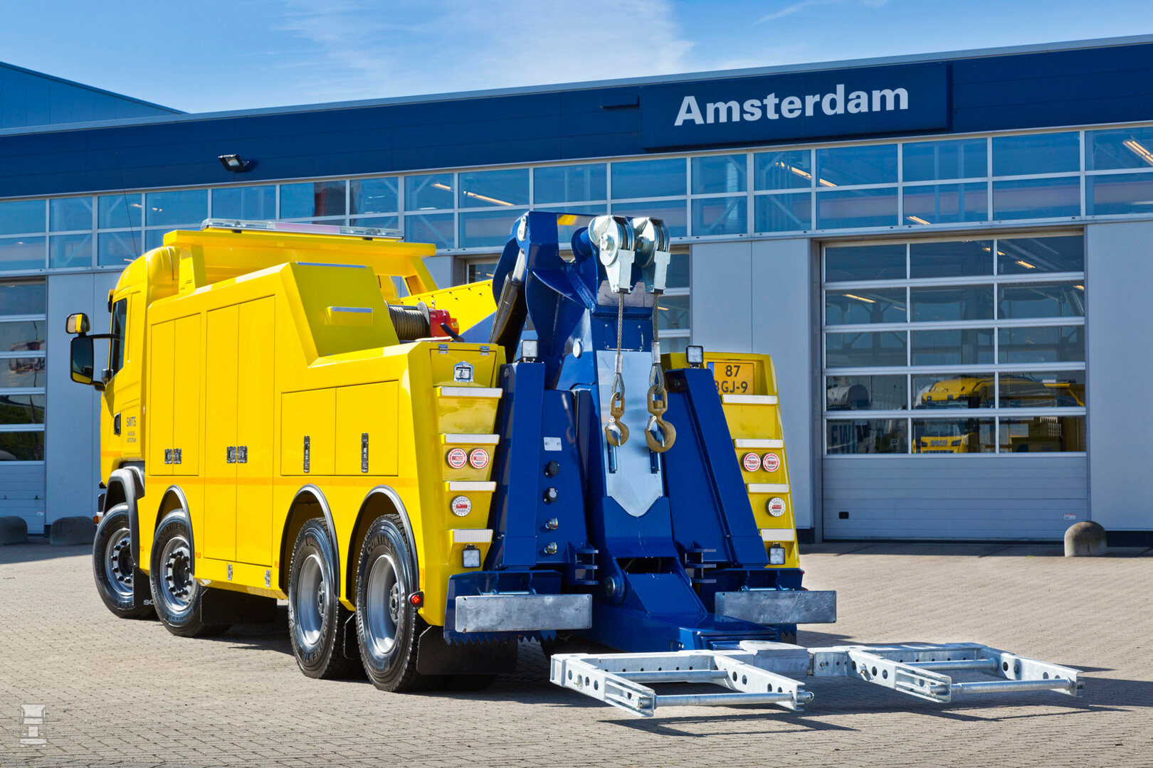 De Scania is een 8x4 met naafreductie in de aangedreven assen en twee gestuurde voorassen voor een compacte draaicirkel. Als bergingsmogelijkheden beschikt de auto over twee lieren van respectievelijk 20 en 15 ton en een 26 tons wreckerinstallatie met een extreem lang uitschuifbare lepel. Voor dat laatste versnelt de afsleepprocedure enorm. De berger kan tijdens het lieren gebruikmaken van twee schepvorming stempels aan de achterzijde van het voertuig die voor extra stabiliteit zorgen. Alle bedieningselementen voor elektrische componenten als lampen en zwaailichten en voor de hydrauliek zijn af fabriek in het dashboard geïntegreerd zodat ook de cabine een strakke nette aanblik heeft. “Normaal is er altijd veel te doen over de inrichting van de opbergkasten,” geeft Otte uitleg over een ander heikel punt bij elk bergingsvoertuig. “Maar hier had De Groot voor zoveel kastjes gezorgd dat we alleen maar een splitsing hoefden te maken tussen materieel dat we veel gebruiken en die spullen die je niet zo vaak nodig hebt. Wat je veel gebruikt, moet je aan de veilige bermzijde van het voertuig opbergen.”