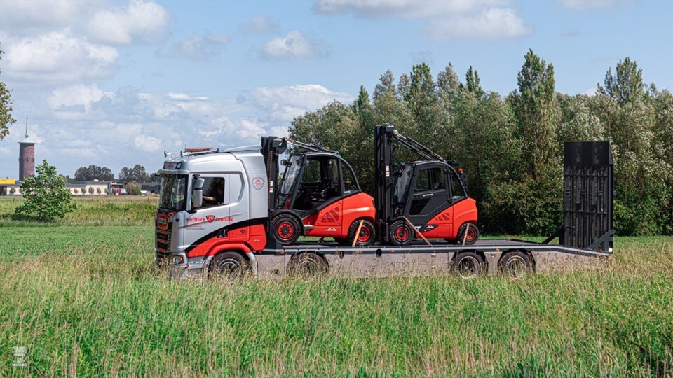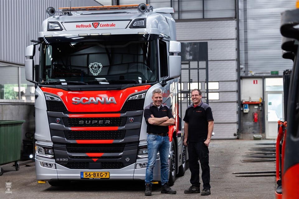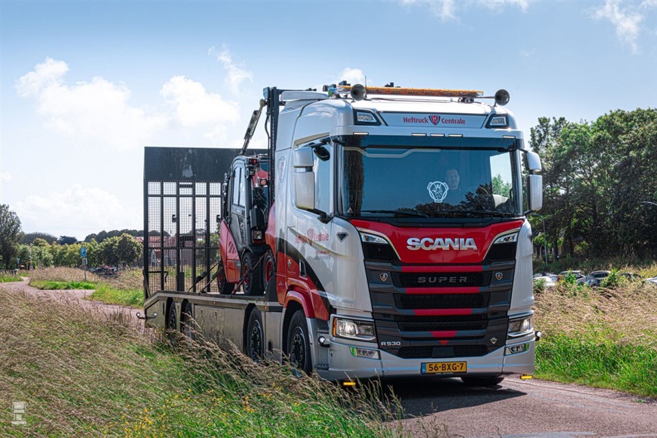 De Scania R530 V8 rijdt al sinds begin dit jaar voor de Heftruck Centrale. De order voor deze bijzondere oprijwagen is nog langer geleden. Een lang traject ging eraan vooraf voor deze krachtpatser helemaal geschikt was voor zijn taak: het vervoeren van zware heftrucks. Dankzij twee 10 tons voorassen mag de Scania maar liefst 39 ton wegen.