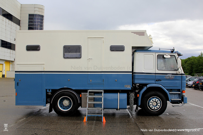 Vorige week tijdens het Lift ‘n’ Load event in Gorinchem zagen we deze bijzondere Scania P93M280 camper staan. Een bijzonder leuke kleinere Scania. Het trekkertje heeft een afneembare opbouw in de vorm van een camper. Als we op de Facebookpagina kijken van eigenaar Mark Slingerland zien we een groot aantal foto`s met een behoorlijk stukje huisvlijt. De camperopbouw blijkt een BDF laadbak te zijn geweest die in eigen beheer helemaal is omgebouwd tot camper. Zelfs een motorfiets kan er mee. Het geheel zit vast met Twistlocks en aan de voorzijde kunnen er 2 steunpoten gemonteerd worden en zo kan het geheel er in 1x vanaf. En gewisseld worden met een platte laadbak. Het Scaniaatje startte zijn carrière in Frankrijk, waar Mark hem kocht en zelf ging halen. In korte tijd werd het trekkertje gedeeltelijk opgeknapt en gespoten in de kleuren zoals we hem nu zien. Aan de bestuurderskant met een luid bulderende sidepipe. De grote tank aan de bijrijderskant is geen dieseltank maar een tank voor het afvalwater en het setje sneeuwkettingen maakt het geheel compleet. Al met al een leuke bijzondere camper waar al wat reisjes (o.a. naar Noorwegen en Frankrijk) mee zijn gemaakt.