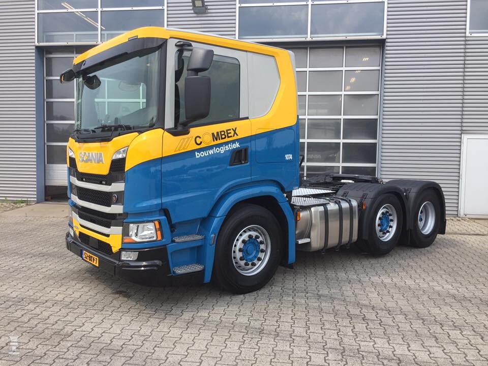 Als je deze nieuwe Scania's van Combex ziet rijden dan is het even goed kijken, want het kan met die nieuwe modellen alle kanten op. Is het nou een R of een P? Het antwoord is twee keer nee, dit is een G-serie. Dat is een model tussen de P- en de R-serie in. Anders dan bij de vorige generatie van Scania is de G niet een wat lager geplaatste R cabine maar een heel eigen ontwerp binnen het modulaire programma. Voor Combex de ideale cabine, zeker in combinatie met het extra lage dak. Combex Bouwlogistiek had meteen zoveel vertrouwen in dit nieuwe concept dat er meteen een order voor vier stuks geplaatst werd bij Scania dealer Rinsma in Drachten. Of dat dan ook meteen vier taarten opleverde is niet duidelijk...