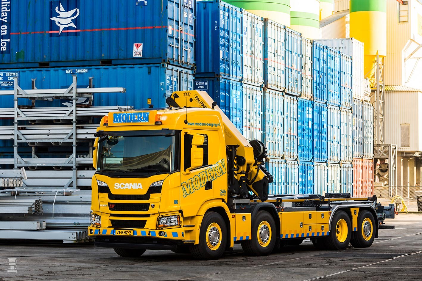 Bergingsbedrijf Modern met vestigingen in Utrecht en Bodegraven zette onlangs een nieuwe Scania G500 8x2*6 met twee sturende voorassen en een gestuurde naloopas op de weg. De in het opvallende bergingsgeel gespoten auto in een XT uitvoering is een echte alleskunner. Hij vervangt een andere Scania die na 23 jaar trouwe dienst nu met pensioen gaat.